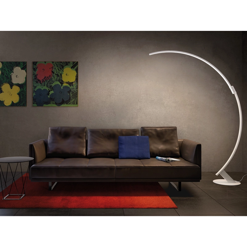 Kyudo est un lampadaire surprenant par sa forme unique. Kyudo est la voie de l’arc, discipline millénaire inspirée de la philosophie zen. Et comme un arc de lumière, le lampadaire transmet des sensations d’équilibre et d’élégance. La séquence continue de LEDs trace un ruban lumineux qui peut être positionné au plaisir, grâce à deux arcs qui composent la structure et glissent l’un sur l’autre. Avec son bras modulable et sa forme originale, ce lampadaire design s'intègre dans tous les salons contemporains.