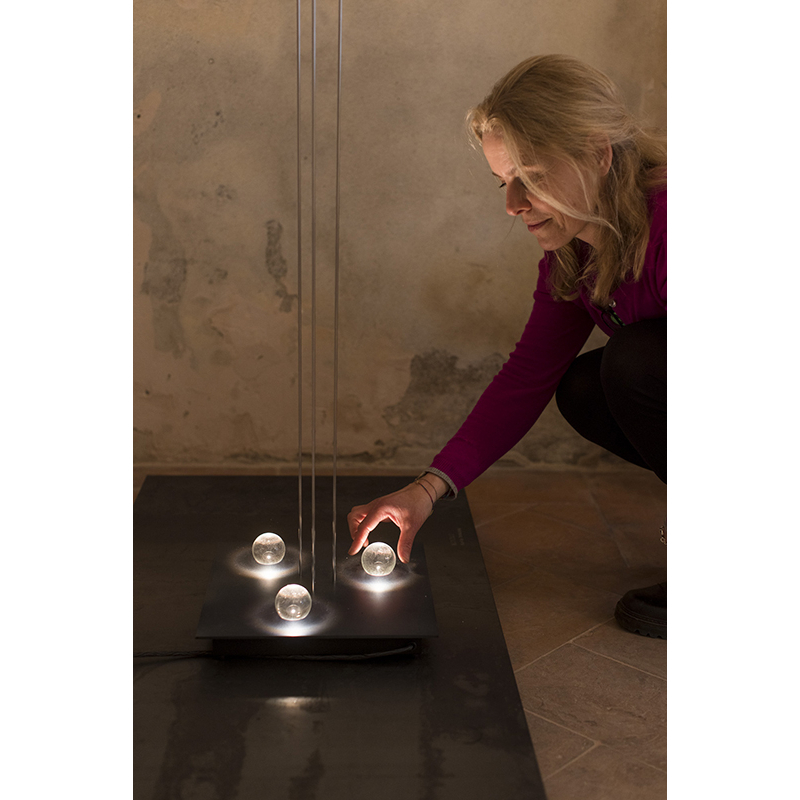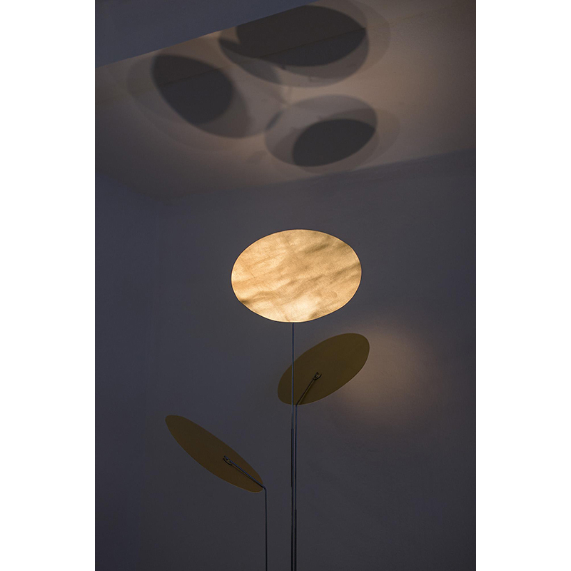 Nuunu est un lampadaire de Flavia Thumshirn pour Ingo Maurer. Poétique et sculptural, ce luminaire émet une lumière chaude grâce à la réflexion avec trois cercles en papier dorés disposés à des tiges en acier inoxydable. Des boules en verre cristallin sont placées sur le socle du lampadaire Nuunu, et diffusent la lumière vers le haut, éclairant le papier doré. Le lampadaire crée un jeu d’ombres au plafond variant selon la luminosité réglée. Les LED sont plus chaudes lorsque baisse l’intensité lumineuse. Les feuilles dorées peuvent se tourner et être ajustées comme on le souhaite, ce qui modifie le jeu d’ombre et de lumière. Inspiré par la nature, le design du lampadaire Nuunu d’Ingo Maurer fait penser à des feuilles d’automnes sur une branche et à des roseaux.