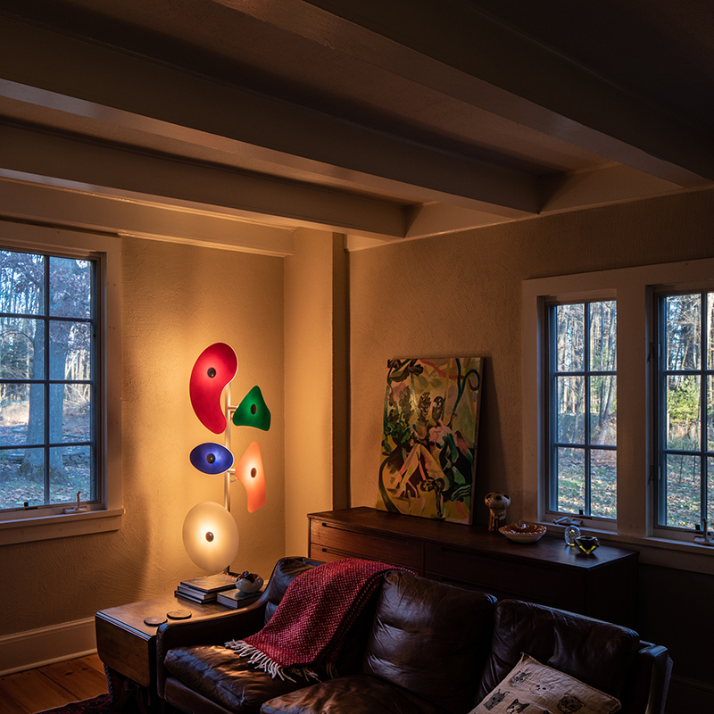 Editée par Foscarini, Orbital est la première lampe de Ferruccio Laviani. Ce lampadaire est aujourd’hui une icône du design. Il se démarque par sa silhouette singulière composée par des formes irrégulières en verre. Le résultat est un luminaire aérien et sculptural. Disponible en version blanche ou multicolore, le lampadaire Orbital Foscarini apporte une lumière chaleureuse et une touche graphique dans tous les intétieurs.