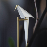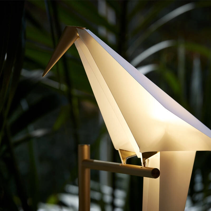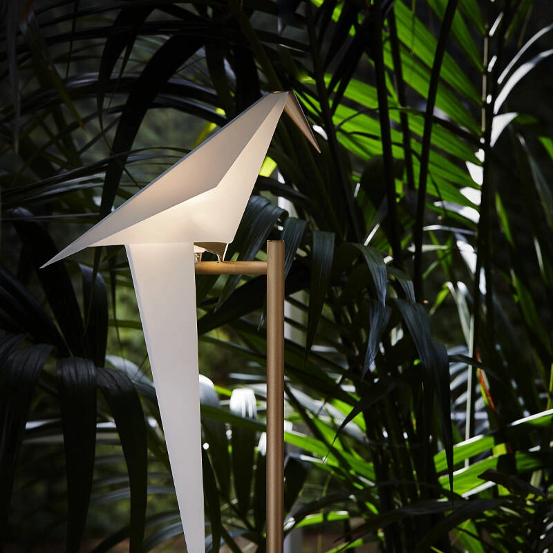 Toute la subtilité de Perch est comprise dans l’équilibre d’une fine structure en métal doré, qui relie la base ou la canopée de la lampe à son diffuseur, dissimulé dans la silhouette d'un oiseau.