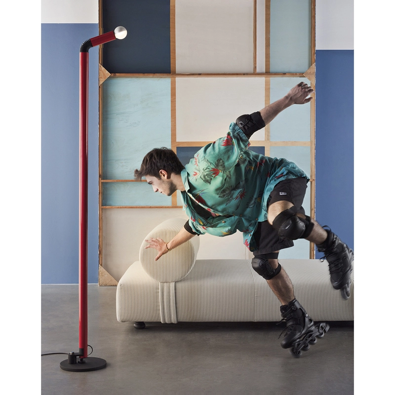 La collection de luminaires Periscopio éditée par Stilnovo a été conçue en pleine « ère spatiale ». Le caoutchouc souple qui recouvre l'articulation rappelle les joints des combinaisons des astronautes. Le système d'articulation et de rotation du bras permet d'ajuster Periscopio dans pratiquement n'importe quelle position. La source LED spéciale, dont la moitié est recouverte d'une surface argentée, évite les éblouissements. Les luminaires Periscopio sont disponibles en lampe à poser et en deux tailles de lampadaires.