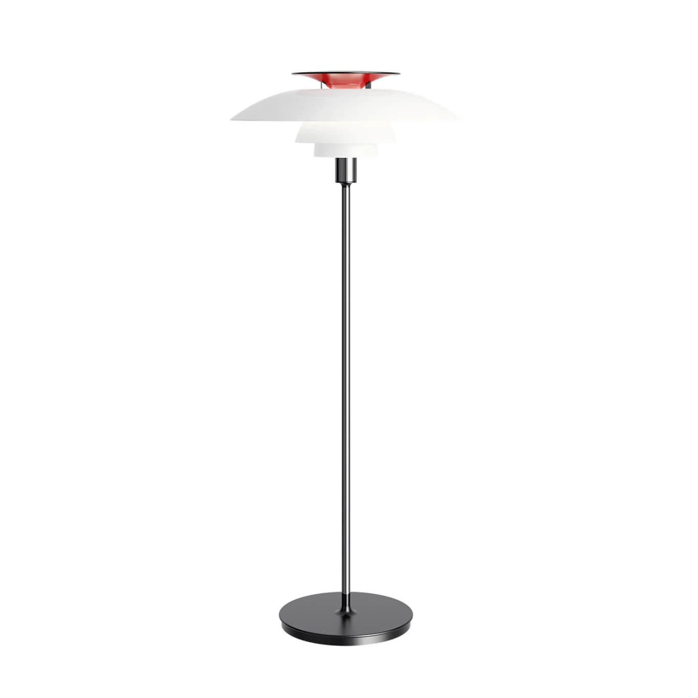 Poul Henningsen a imaginé l’ensemble abat-jour en 1925-26, un système d’éclairage basé sur la spirale logarithmique, créant une lumière directe et anti-éblouissement, tout en produisant des ombres douces. Les premières lampes faisant appel à ce système ont été conçues par Poul Henningsen en coopération avec Louis Poulsen pour un salon à Paris. Basée sur le même concept d’ensemble abat-jour, la lampe PH80 a été créée en 1974, après la mort de Poul Henningsen, pour fêter les 80 ans de sa naissance — d’où le nom PH 80. La majeure partie de la lumière du lampadaire PH 80 est dirigée vers le bas et les abat-jour en acrylique opalisé procurent un éclairage agréable dans la pièce.