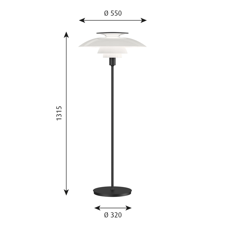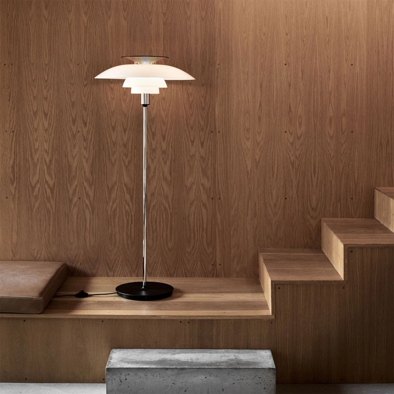 Poul Henningsen a imaginé l’ensemble abat-jour en 1925-26, un système d’éclairage basé sur la spirale logarithmique, créant une lumière directe et anti-éblouissement, tout en produisant des ombres douces. Les premières lampes faisant appel à ce système ont été conçues par Poul Henningsen en coopération avec Louis Poulsen pour un salon à Paris. Basée sur le même concept d’ensemble abat-jour, la lampe PH80 a été créée en 1974, après la mort de Poul Henningsen, pour fêter les 80 ans de sa naissance — d’où le nom PH 80. La majeure partie de la lumière du lampadaire PH 80 est dirigée vers le bas et les abat-jour en acrylique opalisé procurent un éclairage agréable dans la pièce.