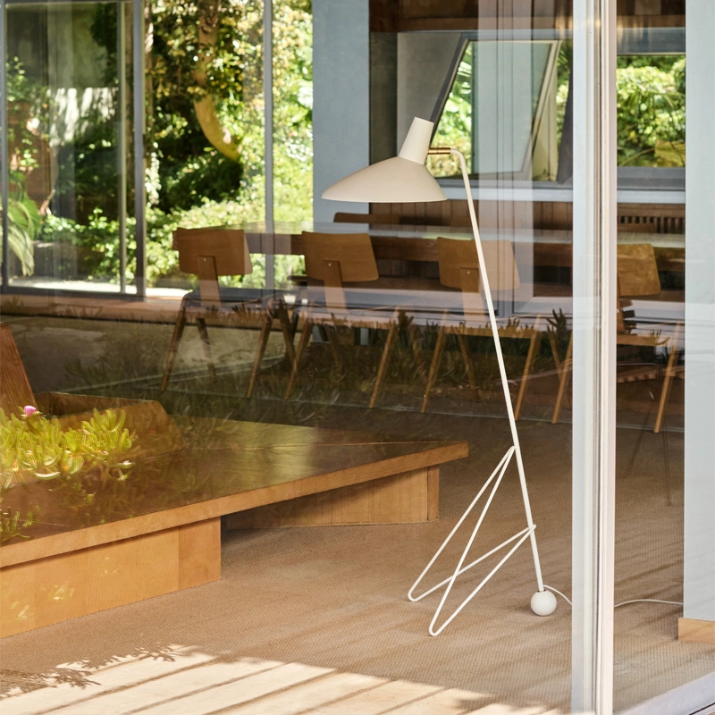Dessiné par Hvidt & Mølgaard, Tripod est un lampadaire minimaliste, réalisé en métal laqué avec des détails en laiton. Considérés comme des maîtres du design danois des années 50, leurs créations apportent souvent une touche sculpturale à l’espace où elles se trouvent. Le lampadaire Tripod ne fait pas exception. Nommé d’après la composition de sa base si particulière, le luminaire est doté de lignes simples et précises qui caractérisent parfaitement l’esthétique des designers. Le pied comporte une sphère lourde qui fait office de contrepoids et permet l’équilibre globale de la lampe. Les premiers croquis du lampadaire Tripod date de 1953, pourtant la lampe n’avait jamais trouvé le chemin de la production. Ainsi, And Tradition édite pour la première ce luminaire unique et intemporel.