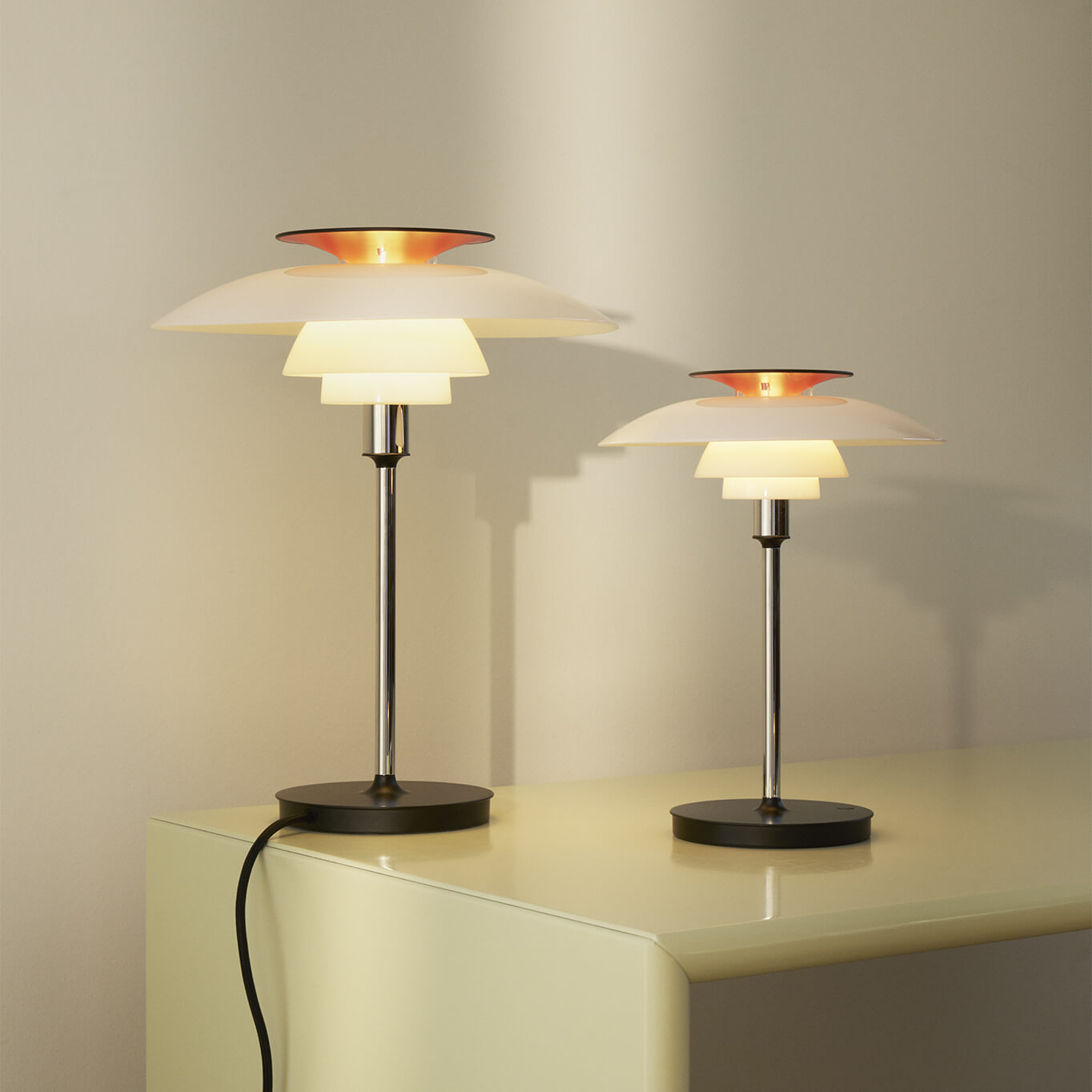 La PH 80 Blanc / Chrome est une lampe de table emblématique dessinée par Poul Henningsen pour Louis Poulsen. Cette réédition célèbre les 80 ans du célèbre designer danois et perpétue son héritage avec une esthétique scandinave pure et élégante. Dotée de ses trois abat-jours en acrylique opale blanc, la lampe diffuse une lumière douce, homogène et sans éblouissement, grâce au système unique de réflecteurs conçu par Henningsen. Sa structure en acier chromé ajoute une touche contemporaine, légère et raffinée. La PH 80 Blanc / Chrome s’intègre parfaitement sur un bureau, une console ou une table d’appoint, offrant un éclairage fonctionnel tout en apportant une présence élégante et intemporelle à votre intérieur.