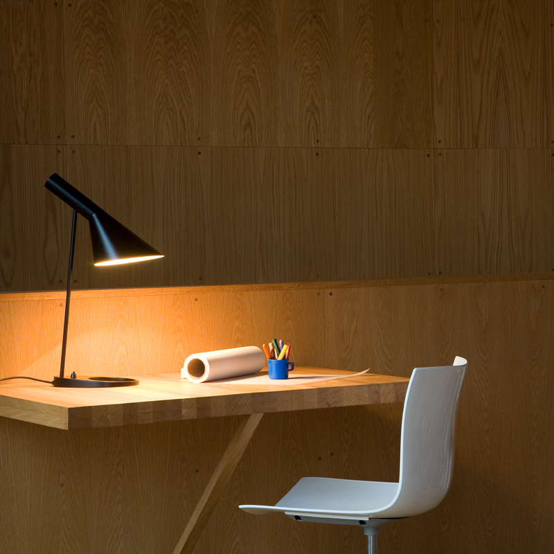 Dessinés par Arne Jacobsen et édités par Louis Poulsen en 1960 pour le SAS Royal Hôtel à Copenhague (Radisson Blu), les luminaires AJ faisaient partie, à l’origine, du concept de design complet créé pour l'Hôtel. Arne Jacobsen a non seulement dessiné les plans de l’hôtel, mais aussi imaginé dans les moindres détails la décoration intérieures de ce dernier. Bon nombre de produits dessinés à cette occasion sont aujourd'hui des icones du design, comme les fauteuils Egg et Swan. Les lampes AJ ont obtenu également une renommée mondiale. Le luminaire émet une lumière asymétrique dirigée vers le bas. La tête de la lampe à poser AJ table, est dirigeable à 60°, peut être inclinée afin d’optimiser l’éclairage. La lampe à poser AJ table présente un design graphique et contemporain reposant sur deux formes géométriques : un cylindre et un cône qui forment son abat-jour orientable. Cet abat-jour est associé à une base ronde sur laquelle est placé l’interrupteur. L’intérieur de l’abat-jour est peint en blanc afin de rendre la lumière douce et confortable. Cette lampe à poser dispose d’un trou situé à la base de la lampe, étant à l’origine conçu pour loger un cendrier, mais apporte aujourd’hui également une part de légèreté et de finesse à la structure. Les luminaires AJ de Louis Poulsen restent au fils du temps des classiques modernes dans le domaine des luminaire design. La lampe à poser AJ table est idéale pour éclairer un couloir, un chevet ou offrir une belle ambiance lumineuse à un salon par exemple. La collection de luminaires AJ est disponible en lampe de table, lampadaire et en applique murale. Pour fêter le 60ième anniversaire du modèle de la lampe à poser AJ table offre une nouvelle sélection de couleurs et de finitions inspirées du travail d’Arne Jacobsen et éditées par Louis Poulsen fabricant danois de luminaires depuis 1874.