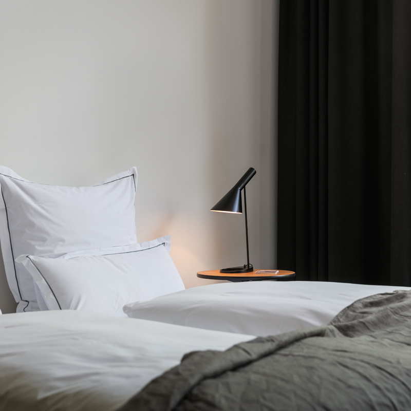 Dessinés par Arne Jacobsen et édités par Louis Poulsen en 1960 pour le SAS Royal Hôtel à Copenhague (Radisson Blu), les luminaires AJ faisaient partie, à l’origine, du concept de design complet créé pour l'Hôtel. Arne Jacobsen a non seulement dessiné les plans de l’hôtel, mais aussi imaginé dans les moindres détails la décoration intérieures de ce dernier. Bon nombre de produits dessinés à cette occasion sont aujourd'hui des icones du design, comme les fauteuils Egg et Swan. Les lampes AJ ont obtenu également une renommée mondiale. Le luminaire émet une lumière asymétrique dirigée vers le bas. La tête de la lampe à poser AJ table, est dirigeable à 60°, peut être inclinée afin d’optimiser l’éclairage. La lampe à poser AJ table présente un design graphique et contemporain reposant sur deux formes géométriques : un cylindre et un cône qui forment son abat-jour orientable. Cet abat-jour est associé à une base ronde sur laquelle est placé l’interrupteur. L’intérieur de l’abat-jour est peint en blanc afin de rendre la lumière douce et confortable. Cette lampe à poser dispose d’un trou situé à la base de la lampe, étant à l’origine conçu pour loger un cendrier, mais apporte aujourd’hui également une part de légèreté et de finesse à la structure. Les luminaires AJ de Louis Poulsen restent au fils du temps des classiques modernes dans le domaine des luminaire design. La lampe à poser AJ table est idéale pour éclairer un couloir, un chevet ou offrir une belle ambiance lumineuse à un salon par exemple. La collection de luminaires AJ est disponible en lampe de table, lampadaire et en applique murale. Pour fêter le 60ième anniversaire du modèle de la lampe à poser AJ table offre une nouvelle sélection de couleurs et de finitions inspirées du travail d’Arne Jacobsen et éditées par Louis Poulsen fabricant danois de luminaires depuis 1874.