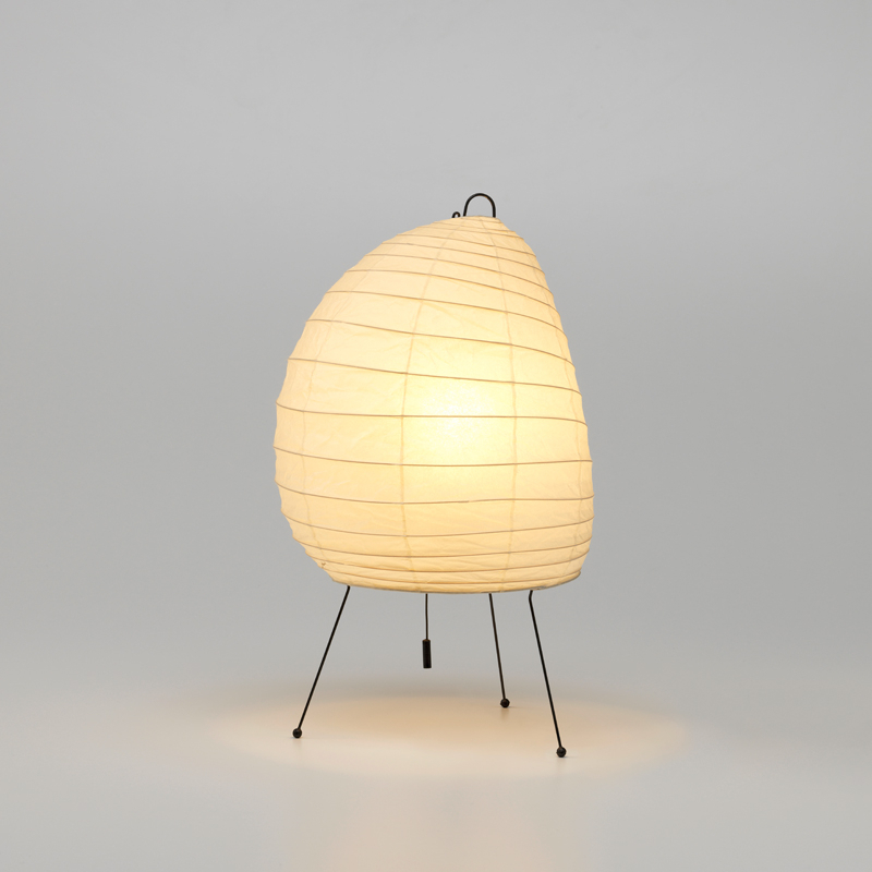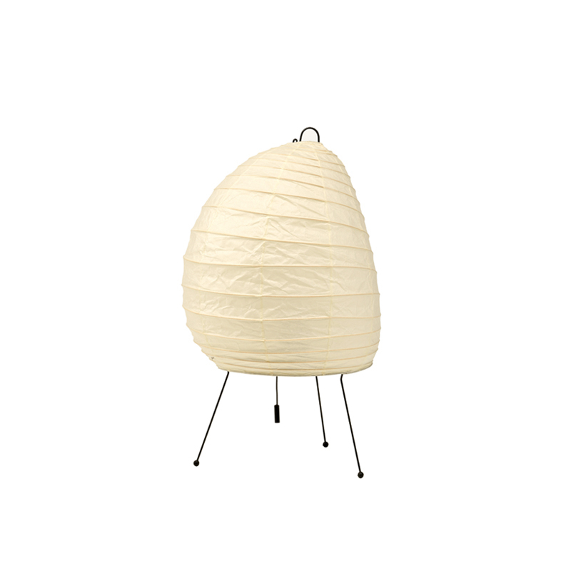 Chacun des luminaires dont Akari 1N est fabriqué à la main : l’ossature de la lampe est obtenue par des tiges de bambou tendues, enveloppées de fines bandelettes de papier washi collées à la structure. Le corps des lampadaires et lampes à poser repose sur un élégant piètement en acier peint.