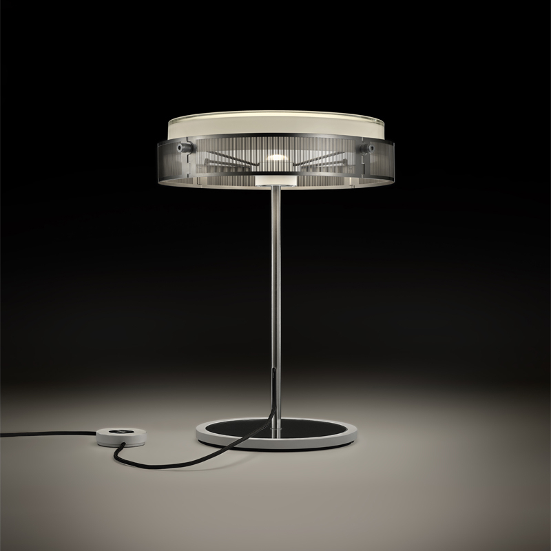 La lampe à poser Anima créée par Jean-Michel Wilmotte est le fruit de la première collaboration entre le célèbre architecte et la marque Lumina, et se présente comme une véritable réinterprétation de la lampe avec abat-jour.  Anima se compose d’un corps de lampe classique en aluminium, d’une source lumineuse masquée par un diffuseur en verre opalin qui émet une lumière douce et agréable, et d’une structure externe composée de 4 pièces en acier photo-découpé.  Cet ensemble est maintenu par une tige en acier inoxydable brossé qui abrite et laisse apparaître le câble d’alimentation en tissu, dont le coloris s’accorde à la finition métallique de la lampe.  La lampe Anima repose sur une base en verre transparent délimitée par un anneau anodisé, et équipée d’un variateur d’intensité. Le luminaire Anima s’annonce comme une revisite particulièrement contemporaine de la lampe avec abat-jour, sans exclure pour autant sa fonctionnalité. Anima se prête à la décoration d’intérieurs classiques et modernes, aux ambiances marquées, mais aussi aux petits espaces comme les bureaux, dont la lampe renforce le caractère.