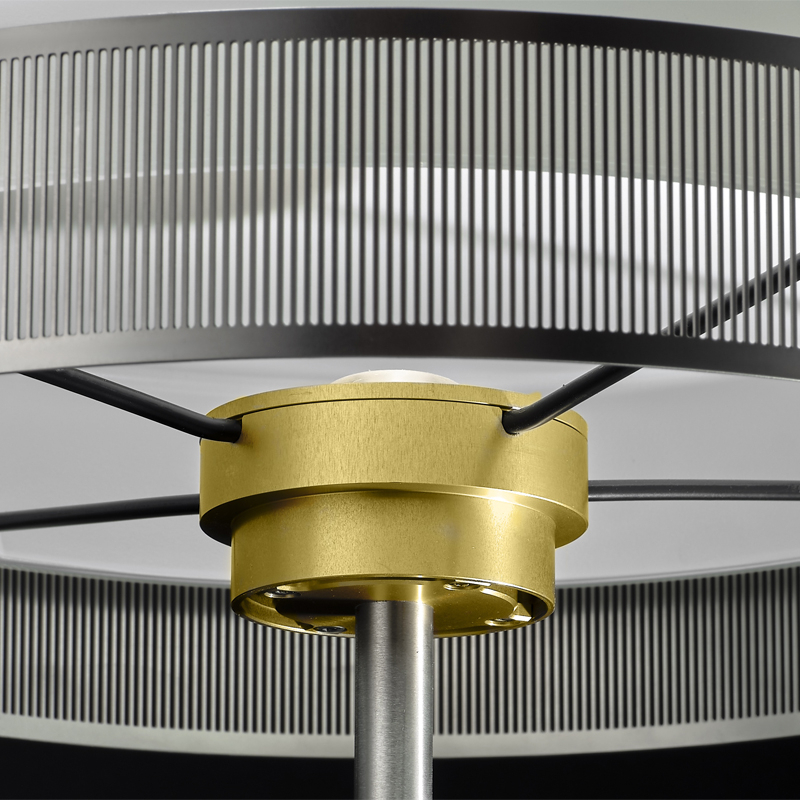 La lampe à poser Anima créée par Jean-Michel Wilmotte est le fruit de la première collaboration entre le célèbre architecte et la marque Lumina, et se présente comme une véritable réinterprétation de la lampe avec abat-jour.  Anima se compose d’un corps de lampe classique en aluminium, d’une source lumineuse masquée par un diffuseur en verre opalin qui émet une lumière douce et agréable, et d’une structure externe composée de 4 pièces en acier photo-découpé.  Cet ensemble est maintenu par une tige en acier inoxydable brossé qui abrite et laisse apparaître le câble d’alimentation en tissu, dont le coloris s’accorde à la finition métallique de la lampe.  La lampe Anima repose sur une base en verre transparent délimitée par un anneau anodisé, et équipée d’un variateur d’intensité. Le luminaire Anima s’annonce comme une revisite particulièrement contemporaine de la lampe avec abat-jour, sans exclure pour autant sa fonctionnalité. Anima se prête à la décoration d’intérieurs classiques et modernes, aux ambiances marquées, mais aussi aux petits espaces comme les bureaux, dont la lampe renforce le caractère.
