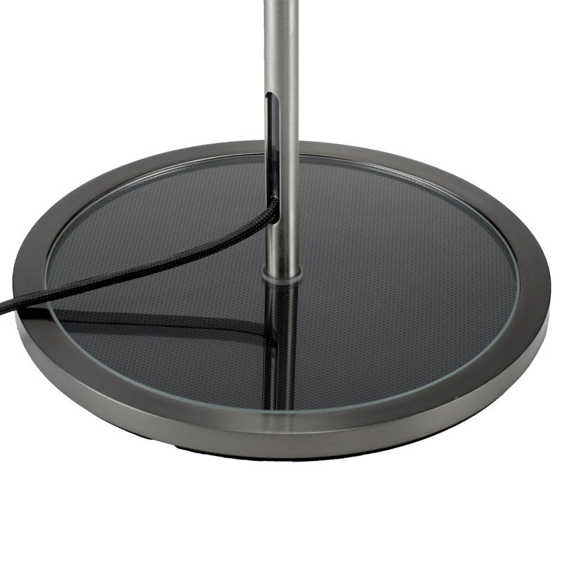 Cet ensemble est maintenu par une tige en acier inoxydable brossé qui abrite et laisse apparaître le câble d’alimentation en tissu, dont le coloris s’accorde à la finition métallique de la lampe.