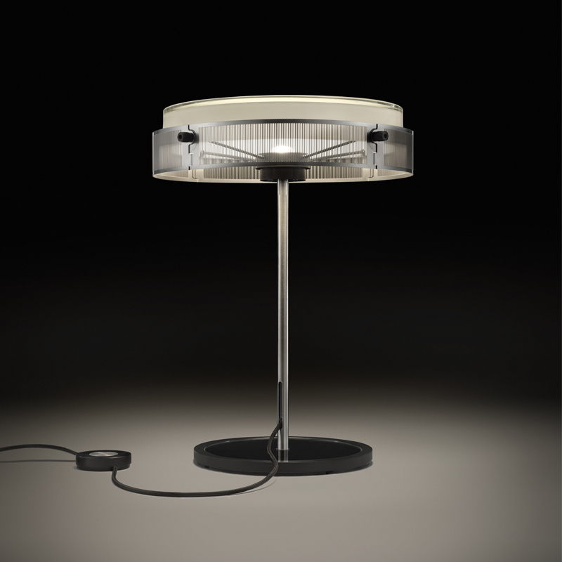 La lampe Anima repose sur une base en verre transparent délimitée par un anneau anodisé, et équipée d’un variateur d’intensité.