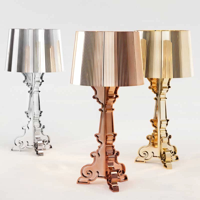 Bourgie, créée par Ferruccio Laviani pour Kartell, est une lampe de table mélangeant tradition et modernité. Sa base, de style baroque, est constituée de trois niveaux décorés qui s'entrecroisent et son ample abat-jour est réalisé avec un effet plissé de manière à créer, lorsque la lampe est allumée, un jeu de mille reflets. Grâce à un système d'accrochage particulier de l'abat-jour, il est possible d'obtenir trois hauteurs différentes (68, 73 et 78 cm). Chacun peut choisir de monter la lampe Bourgie à la hauteur qu'il préfère puis la modifier à sa guise selon l'utilisation qu'il veut en faire. Bourgie est une icône design de la collection de luminaires Kartell et est disponible en finition argent, cristal ou noir.