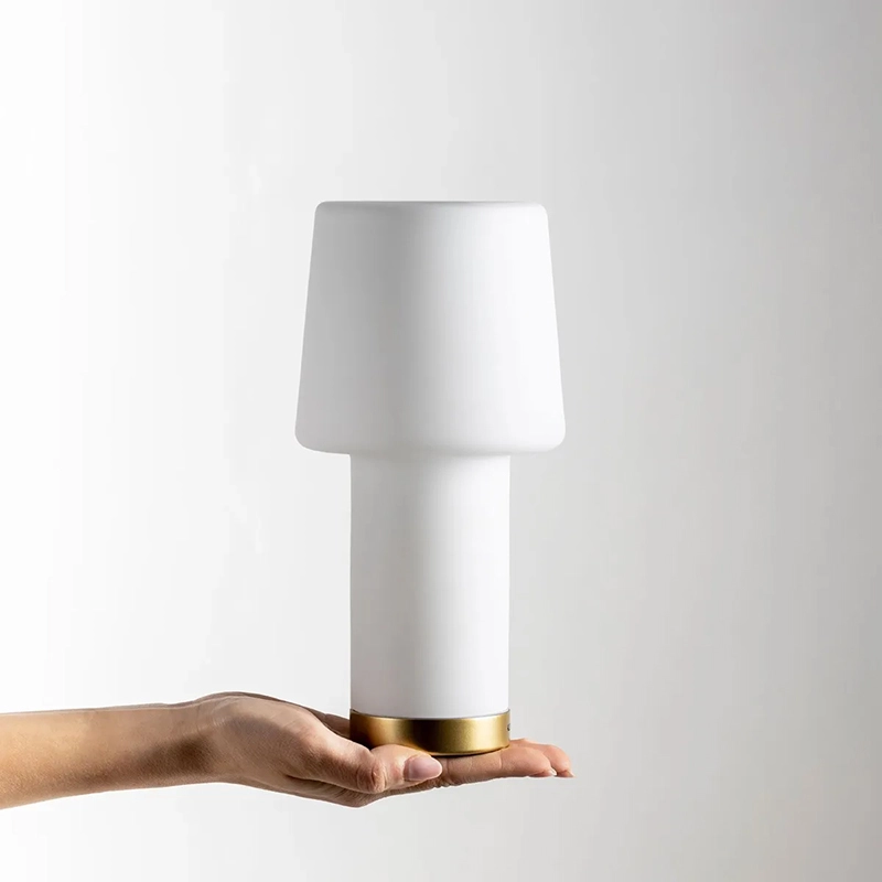 Conçue par le Studio Claesson Koivisto Rune pour Fontana Arte, Cameo est une lampe sans fil pleine de caractère et de personnalité, tout en étant discrète et élégante. La lampe sans fil Cameo est réalisée en verre soufflé blanc brillant, avec une base en métal. L'anneau métallique décoratif, placé sur le diffuseur, est réalisé dans le même matériau et la même finition que la base et présente le logo FontanaArte sérigraphié. Un bouton tactile transparent permet d'allumer et d'éteindre la lampe et de régler l'intensité lumineuse. La lampe est alimentée par une batterie rechargeable d'une durée de vie de 8 heures, rechargeable via le câble USB inclus. Aussi jolie que pratique, la lampe Cameo convient pour un usage intérieur et extérieur.