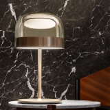 Equatore est une réinterprétation contemporaine de la lampe classique avec un abat-jour en verre. Alors que l'abat-jour traditionnel sert à contenir la source de lumière à l'intérieur, dans cette famille de lampes, l'abat-jour est paradoxalement vide, la lumière étant générée par deux disques lumineux placés à l'intérieur d'une bande métallique centrale, visible sur l'abat-jour, qui évoque la ligne de l'équateur. La lumière produite par les Led, grâce à des écrans internes disposés en couches, est distribuée régulièrement sur la surface des disques, les éclairant comme par magie. Le disque inférieur dirige la lumière vers le bas, le disque supérieur illumine la cloche en verre pour une lumière douce et diffuse. Editée par