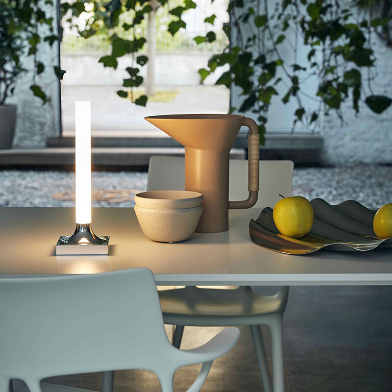Pour la lampe Goodnight, Philippe Starck s’est inspiré de la source de lumière la plus romantique : la bougie, avec ses reflets doux et chauds. Editée par Kartell, la lampe portable Goodnight revisite le concept et la forme primordiale de la bougie en la transformant en un objet hautement technologique. Fonctionnant sur batterie, la lampe fournit un éclairage de très longue durée ainsi que trois niveaux d'intensité lumineuse. La lampe Goodnight Kartell trouve sa place aussi bien dans un espace domestique que dans un environnement collectif, comme un restaurant ou un hôtel.
