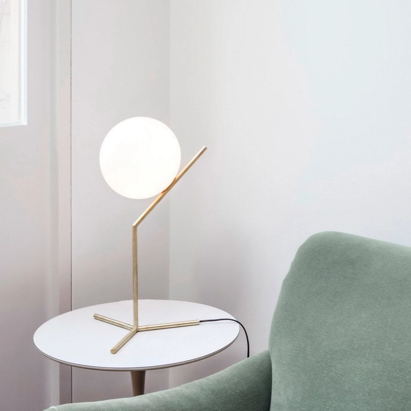 lampe IC light T1 High repose sur les principes physiques de l’équilibre afin de donner l’illusion de flotter dans l’air. La lampe à poser est composée d'une sphère en verre soufflé qui semble être juste en équilibre sur une fine tige de métal grâce à une jonction à peine visible. Le trépied sur lequel est accroché le diffuseur, est en forme de patte d’oiseau, créant une sensation de légèreté. Le diffuseur est en verre soufflé blanc, dégageant une lumière douce et chaleureuse, d’une forme sphérique permettant une diffusion de la lumière sur 360°. La