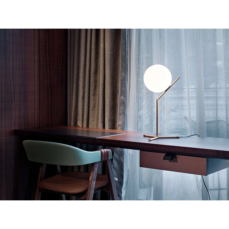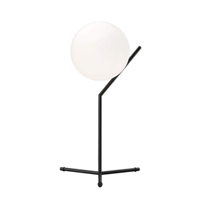lampe IC light T1 High repose sur les principes physiques de l’équilibre afin de donner l’illusion de flotter dans l’air. La lampe à poser est composée d'une sphère en verre soufflé qui semble être juste en équilibre sur une fine tige de métal grâce à une jonction à peine visible. Le trépied sur lequel est accroché le diffuseur, est en forme de patte d’oiseau, créant une sensation de légèreté. Le diffuseur est en verre soufflé blanc, dégageant une lumière douce et chaleureuse, d’une forme sphérique permettant une diffusion de la lumière sur 360°. La