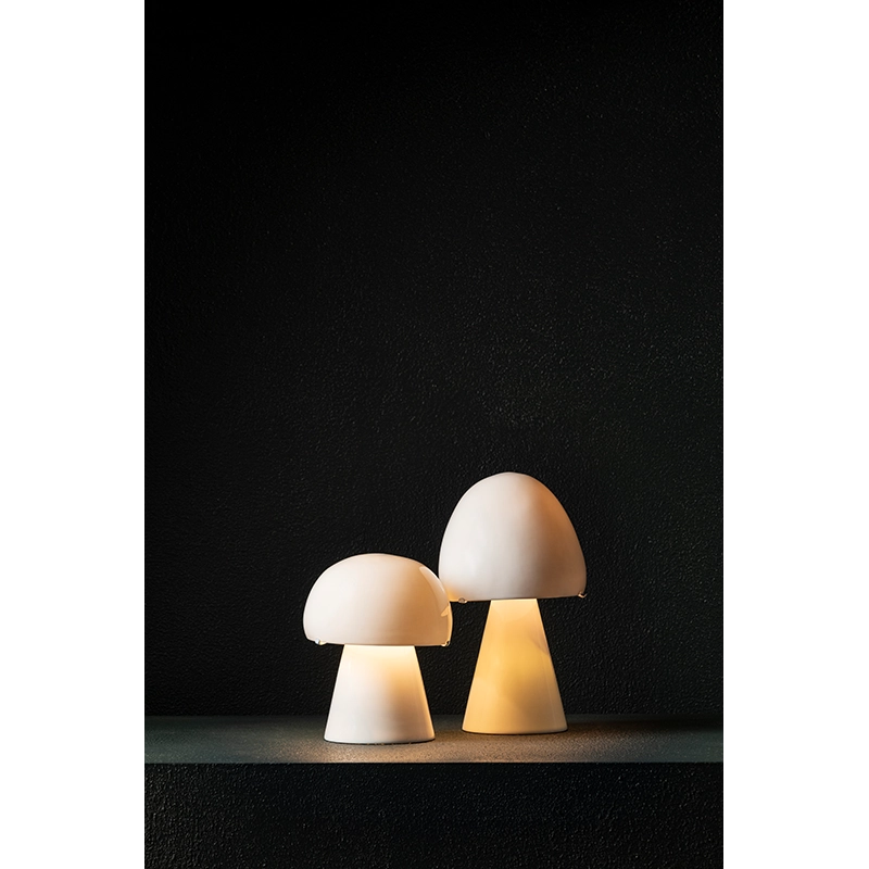 La lampe de table Joe 2, créée par la designer et céramiste Anita Le Grelle pour Serax, s'inspire des formes organiques des champignons des années 60. Avec sa silhouette nostalgique et naïve, Joe 2 convient parfaitement aux chambres d'enfant, mais pas seulement. Le socle et l'abat-jour cette lampe à poser abritent chacun une ampoule, illuminant l'intérieur grâce à la porcelaine bone china translucide. Disponible en deux versions, la petite lampe Joe 2 est équipée d'un cordon en tissu doré avec interrupteur.