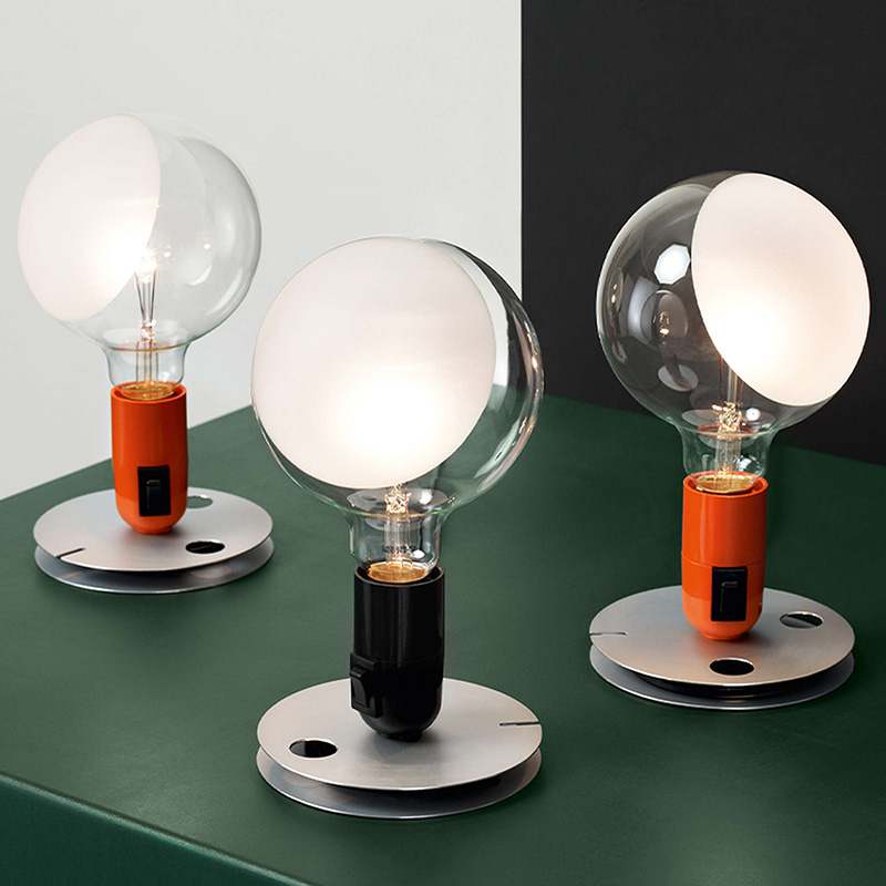 Achille Castiglioni crée, en 1972, cette lampe de table Lampadina très pratique. Elle possède une base en aluminium anodisé qui permet également d'enrouler le câble électrique. L'interrupteur ON/OFF basculant est placé sur la douille en bakélite. L'ampoule Globulux en verre transparent est partiellement sablée permettant une émission directe et diffuse. La Lampadina de Flos existe en noir ou en orange.