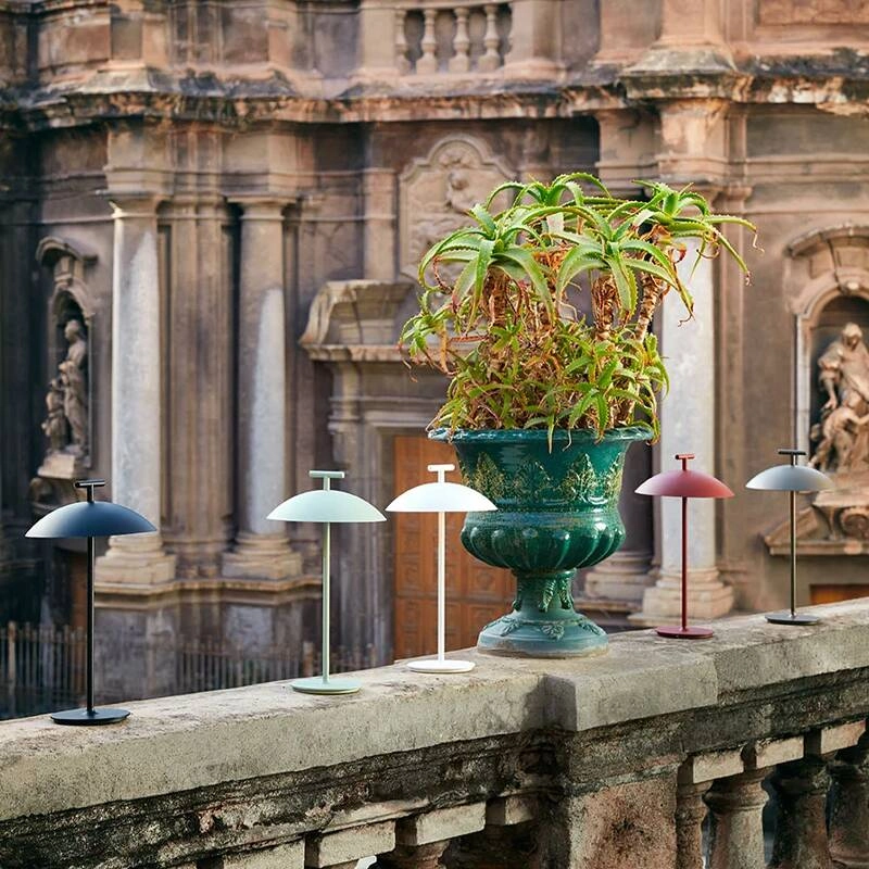 Mini Geen-A, créée par Ferruccio Laviani pour la marque Kartell, est une petite lampe élégante et pratique qui reprend les mêmes éléments caractéristiques que le lampadaire Geen. Elle se distingue par son abat-jour en forme de coupole, surmonté d’une petite poignée en forme de T. La lampe Mini Geen-A est disponible avec une alimentation électrique directe ou en version portable, fonctionnant sur batterie. La Mini Geen-A Kartell avec prise est parfaite pour être installée sur une table de chevet ou un bureau par exemple, tandis que la version sur batterie se déplace facilement selon les besoins, pour un éclairage d’appoint à l’intérieur ou bien à l’extérieur pour profiter des longues soirées d’été.