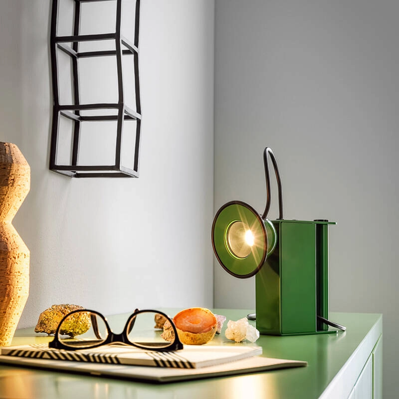 Conçue par Gae Aulenti et PieroCastiglioni en 1981 pour Stilnovo, la lampe à poser Minibox est composée d'un corps en métal, d'une poignée confortable et d'un œil lumineux irrévérencieux, qui rappelle l'esthétique des lampes de mineurs. Le couplage magnétique de la tête Minibox vous permet d'orienter la lumière, ce qui la rend adaptée à tous les espaces, même le plus inattendu.