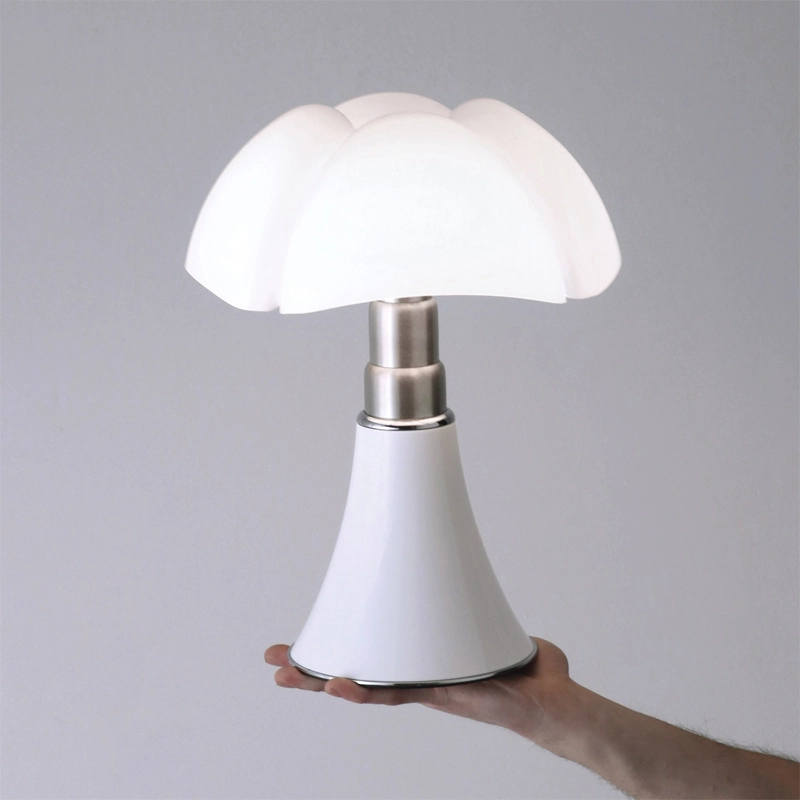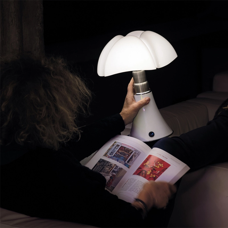 Minipipistrello sans fil est la version mini et portable de la Pipistrello, classique du design dessinée en 1966 par Gae Aulenti. Reine du design italien depuis plus de 50ans, la lampe Pipistrello Martinelli Luce est composée d’une base tulipe en métal, d’un bras en acier inoxydable brossé télescopique et d’un diffuseur en méthacrylate blanc opalin. Le dessin de son diffuseur s’inspire des ailes de la « pipistrello », chauve-souris d’Europe d’où elle tient son nom. En effet, la forme de la base évasée se développe en hauteur en s’élargissant au niveau des nervures du diffuseur comme les ailes d’une chauve-souris. La Minipipistrello Cordless est une lampe de table portable équipée d'une source LED intégrée, d'un variateur d'intensité lumineuse et d'une batterie rechargeable. Une lampe design à emporter partout avec vous !