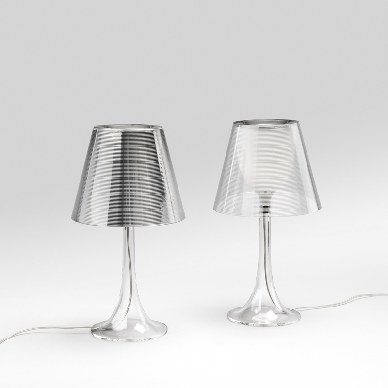 Philippe Stark fait une relecture de la lampe de chevet classique en dessinant Miss K pour Flos. Le corps de cette lampe de table est en PMMA moulé par injection. Le diffuseur interne est en polycarbonate opalin moulé par injection et le diffuseur externe est en polycarbonate moulé par injection aluminé ou en tissu plissé. Eteinte, la lampe est opaque. Allumée, le diffuseur interne apparaît. Le jeu de lumière de la lampe Miss K Flos est intensifié grâce au variateur d'intensité lumineuse.