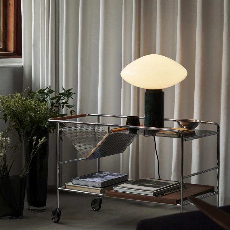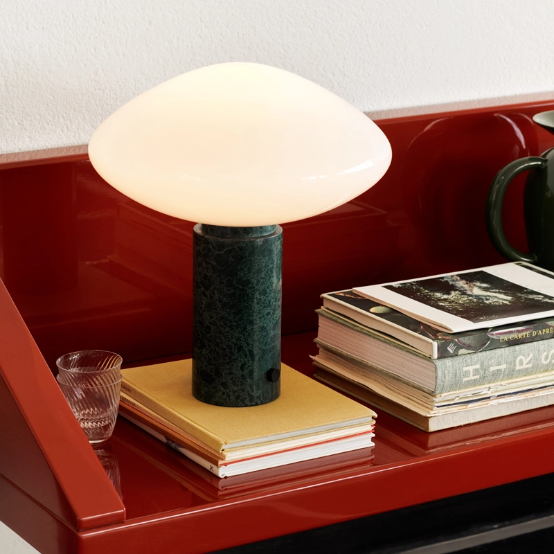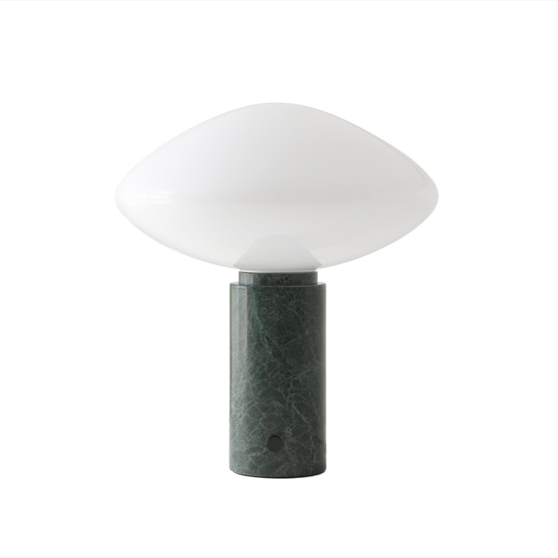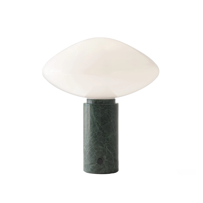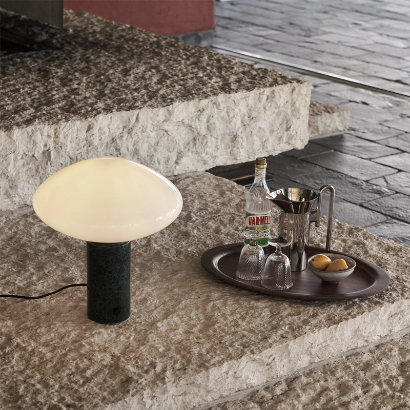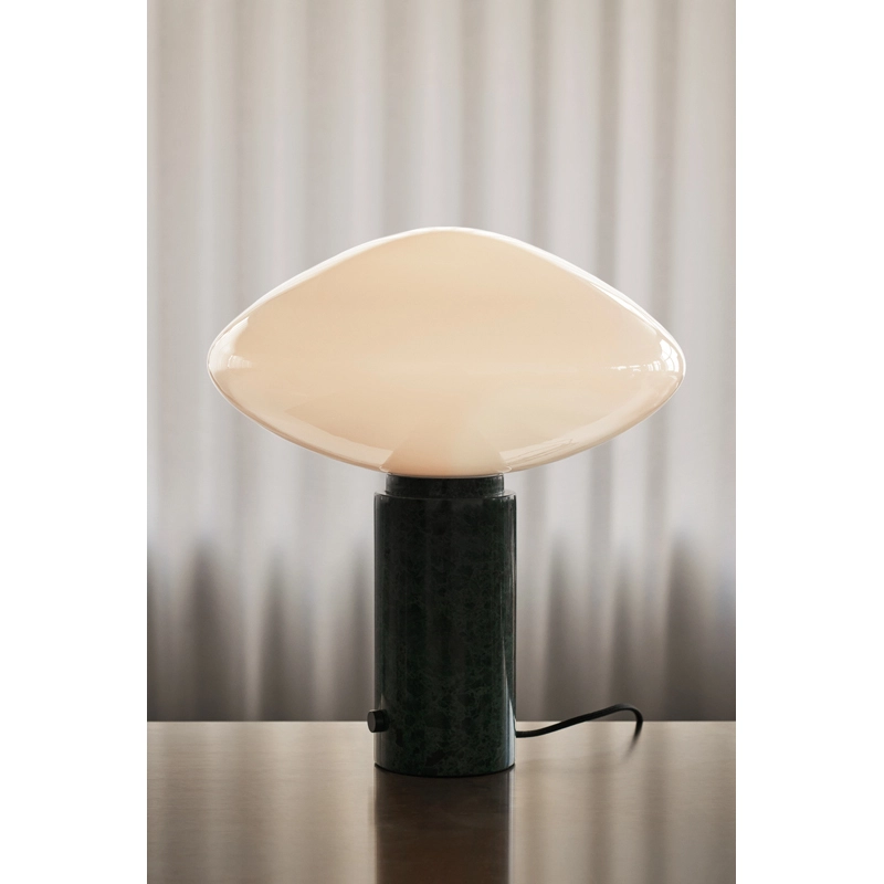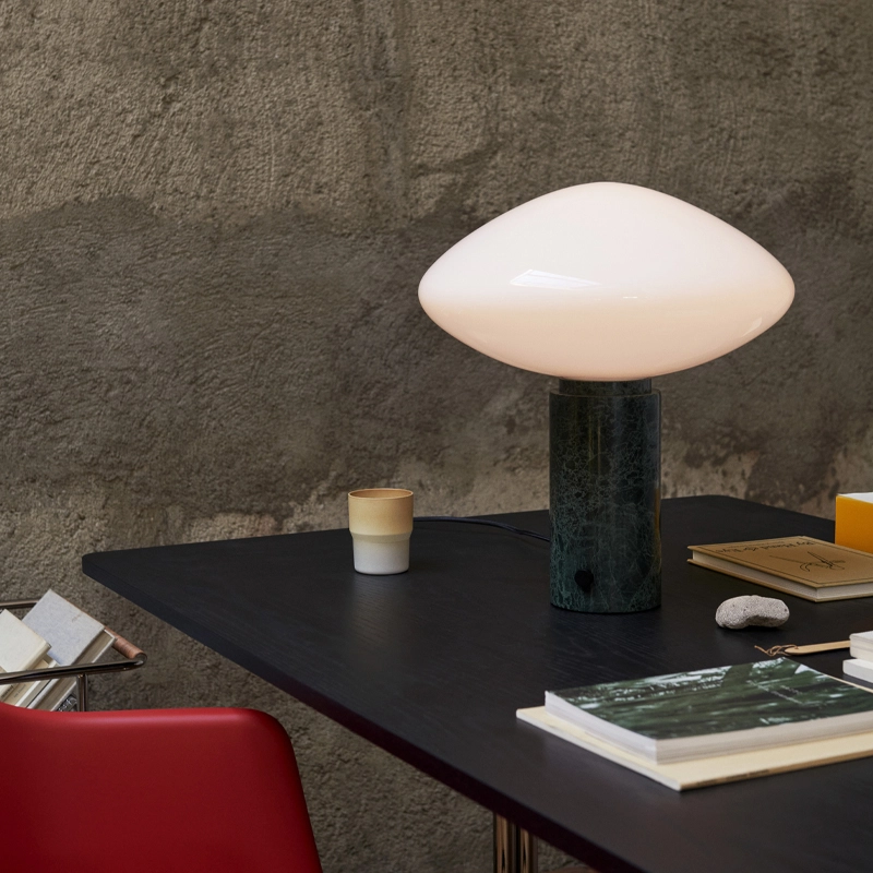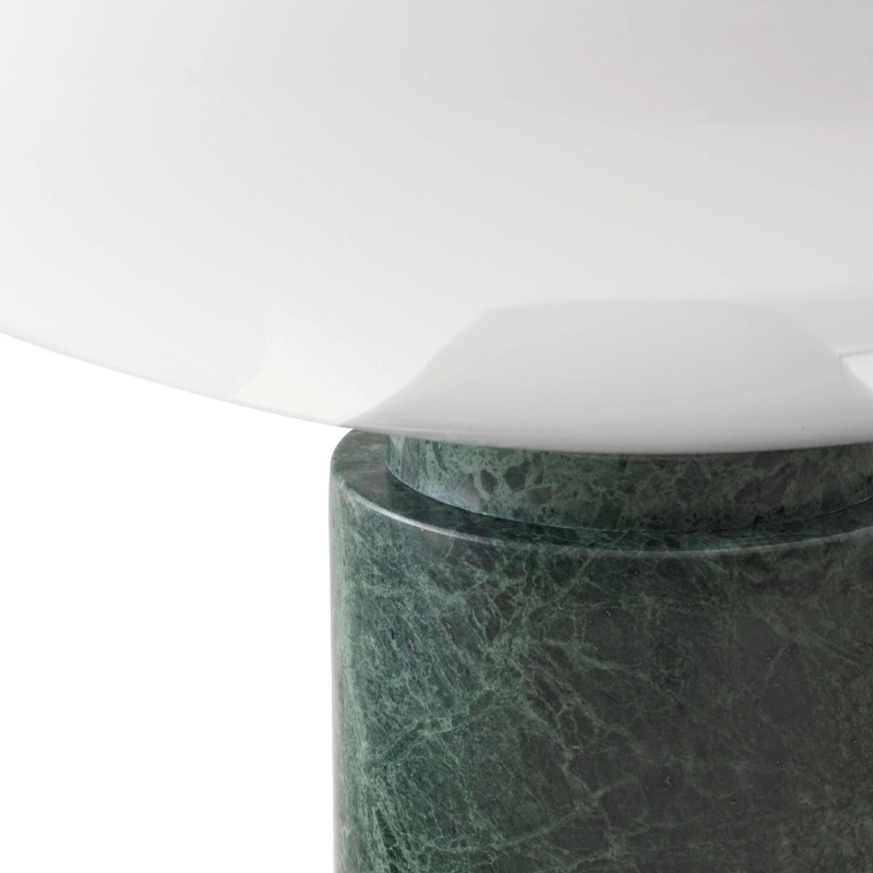 Le diffuseur de la lampe à poser Mist est réalisé en verre opalin soufflé à la bouche, tandis que la base est en marbre vert épais. Le contraste entre la forme légère du verre et la solidité du marbre crée un design élégant et texturé. La série d'éclairage Mist ajoute une touche de luxe discret à tous les designs d'intérieur, offrant une combinaison parfaite de forme, de fonction, d’élégance et de chaleur.