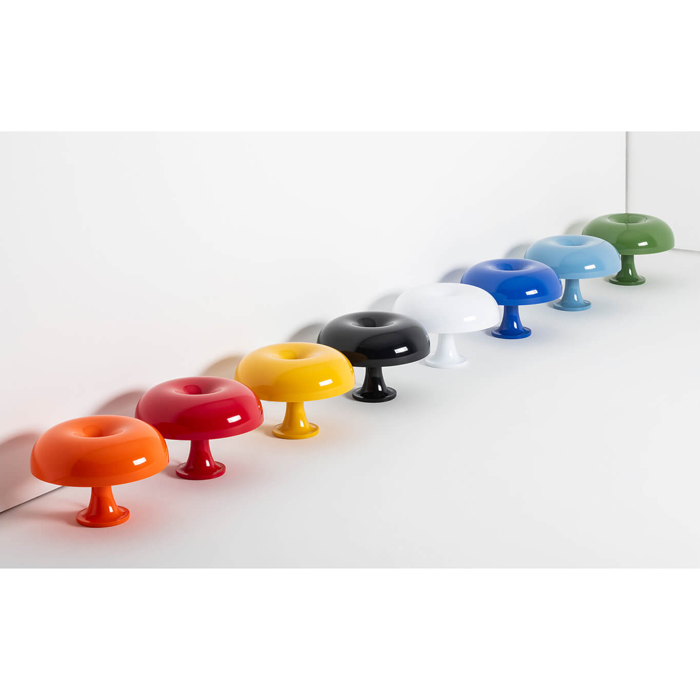 Nessino, dessinée par Giancarlo Mattioli, est l'édition actualisée et revisitée de la célèbre lampe de table Nesso, éditée par Artemide, qui avait remporté le 1er prix du Concours Studio Artemide/Domus à Milan en 1965 et reconnaissable par sa forme de champignon et ses couleurs très années 70. Le corps et le diffuseur sont en polycarbonate. Sa lumière est diffuse et colorée. Nessino est disponible en orange, orange transparent ou blanc apporter une touche de gaieté dans votre chambre ou dans le salon.