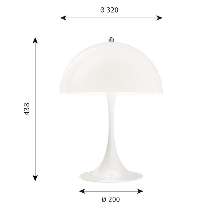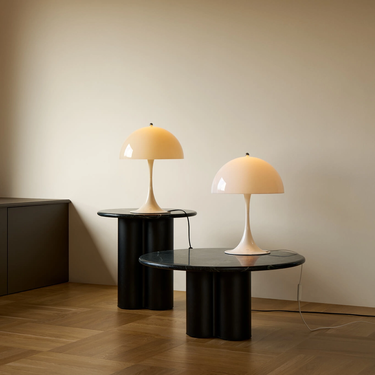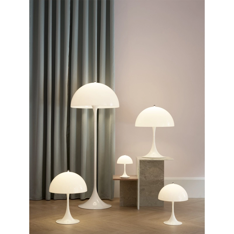 Le luminaire émet une lumière douce, anti-éblouissante et feutrée. Les versions à abat-jour métallique dirigent la lumière directement vers le bas, créant un éclairage agréable grâce à leur abat-jour peint en blanc à l’intérieur et à l’effet réfléchissant de son pied en forme de trompette. La version en acrylique opalisé de la lampe de table Panthella génère une atmosphère lumineuse diffuse et confortable grâce à sa transparence, à la réflexion vers le bas créée par l’abat-jour intérieur, et à la réflexion créée par le pied en forme de trompette.