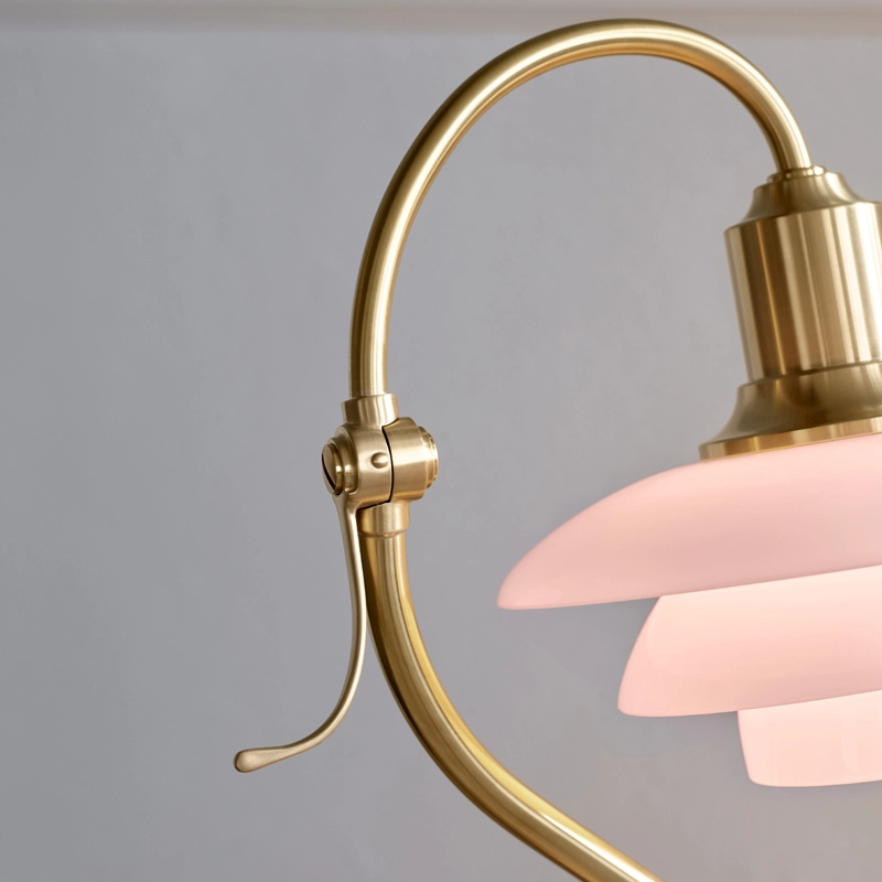La lampe de table PH 2/2 Question Mark, conçue à l'origine par Poul Henningsen en 1931 pour Louis Poulsen, est basée sur le célèbre système à trois abat-jours réfléchissants connu sous le nom de System PH. Son nom fait référence à la courbure distinctive de son pied, et cette petite lampe de table possède une tête de lampe réglable qui peut pivoter de 45 degrés, vous permettant de diriger la lumière selon vos préférences. La lampe de table PH 2/2 Question Mark Pale Rose, éditée par Louis Poulsen, est une version moderne de la PH 2/2, associant le verre opalin rose pâle et des éléments en laiton brossé aux lignes fines qui suivent la forme du luminaire. Cette combinaison offre une expression élégante et classique, intemporelle et parfaitement adaptée aux intérieurs contemporains. La lampe de table PH 2/2 Question Mark apporte à la fois fonctionnalité et esthétique à votre espace. Son design emblématique, associé à la teinte rose pâle et aux finitions en laiton brossé, crée une atmosphère chaleureuse et raffinée.