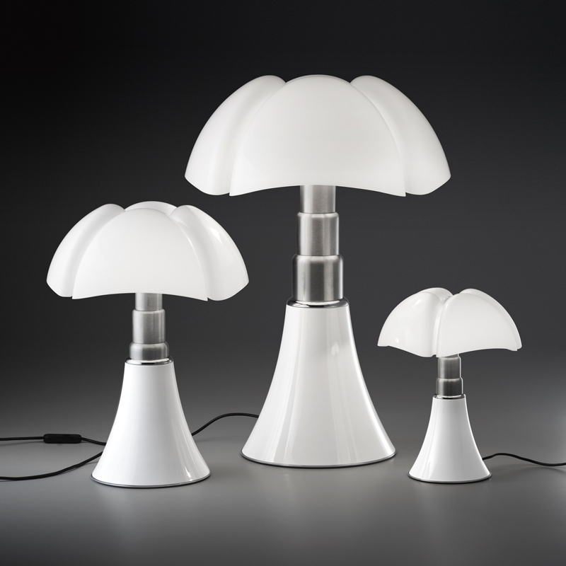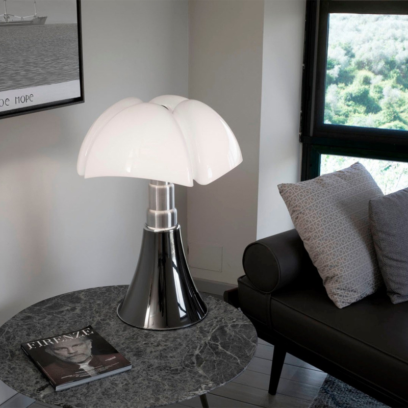 lampe de table avec une lumière diffuse. Plus petite que la version classique, sa hauteur est réglable entre 50 et 62 cm de hauteur, grâce à un système télescopique. Cette version est équipée d'une source LED intégrée et d'un variateur d'intensité lumineuse. Le dessin de son diffuseur s’inspire des ailes de la « pipistrello », chauve-souris d’Europe d’où elle tient son nom. En effet, la forme de la base évasée se développe en hauteur en s’élargissant au niveau des nervures du diffuseur comme les ailes d’une chauve-souris. La lumière diffuse que la