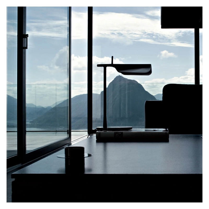Création d'Edward Barber et Jay Osgerby, Tab T est une lampe de table à émission directe. Le diffuseur est orientable grâce à une petite poignée sur le dessus de la lampe qui permet de ne pas se brûler. La tête, les joints et la base  de  Tab T sont en aluminium moulé sous pression. Le réflecteur est en porcelaine et le cordon électrique mesure 160cm. Ses lignes simples et modernes en font une parfaite compagne de bureau. Editée par Flos, la lampe TAB T est déclinée en noir et en blanc.