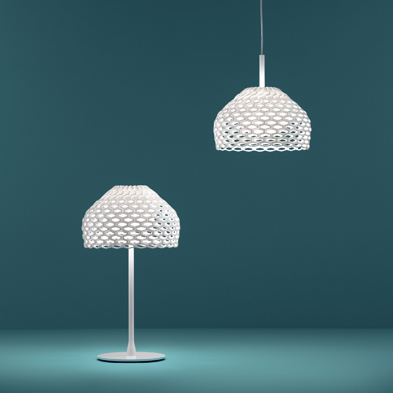 Tatou est une série de luminaires dessinée par l'incontournable designer Patricia Urquiola pour la marque Flos. Cette collection se caractérise par un abat-jour inspiré de la carapace du « tatou », l'animal éponyme, connu pour sa peau constituée de plaques se chevauchant entre elles. Patricia Urquiola réalise ainsi un luminaire minutieux, tel la forme des armures japonaise, un ensemble de boucles en métal savamment attachées par des rubans. La lampe est équipée d'un diffuseur externe en polycarbonate qui se décline en blanc, noir ou ocre. Le diffuseur interne est réalisé en polycarbonate opalin, qui émet une lumière diffuse dans toute la pièce. La suspension est du plus bel effet au-dessus d'une table de repas, tandis que la lampe à poser est parfaite sur une table de chevet, grâce aux matériaux utilisés et sélectionnés pour leur grande interaction avec la lumière.