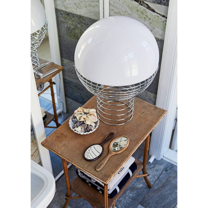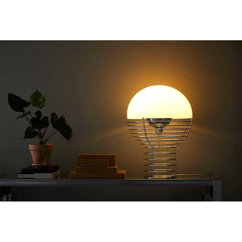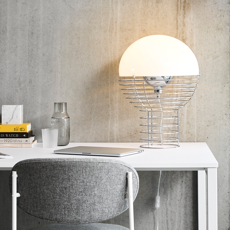 Dessinée par Verner Panton en 1972, la lampe à poser Wire se distingue par sa structure en tige d’acier chromé qui s’élargit vers le haut pour supporter un diffuseur hémisphérique en plastique blanc. L’ampoule est contenue dans un petit réflecteur en métal qui guide la lumière à l’intérieur du diffuseur. La structure filaire donne au design une apparence à la fois sculpturale et légère, tandis que le diffuseur blanc offre une lumière douce et chaleureuse. Editée par Verpan, la lampe à poser Wire est une pièce iconique qui s’intègre dans tous les intérieurs contemporains.