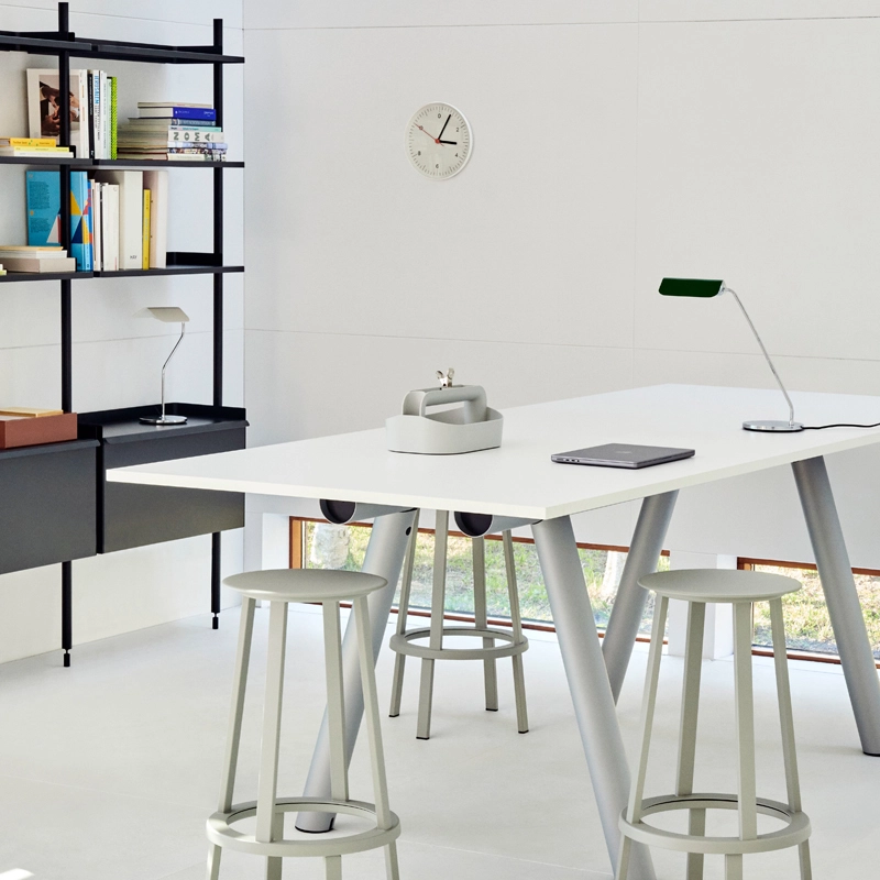 S’inspirant de la lampe classique de banquier, le designer John Tree fusionne des références archétypales avec sa sensibilité contemporaine pour créer la lampe Apex. L’abat-jour en acier plié crée une silhouette de toit pointu, offrant un contraste graphique avec la base chromée. L’abat-jour peut pivoter à 360°, permettant à l’utilisateur de diriger la lumière comme il le souhaite. Editée par Hay, Apex est une lampe fonctionnelle, parfaite pour une multitude d’espaces et utilisations.
