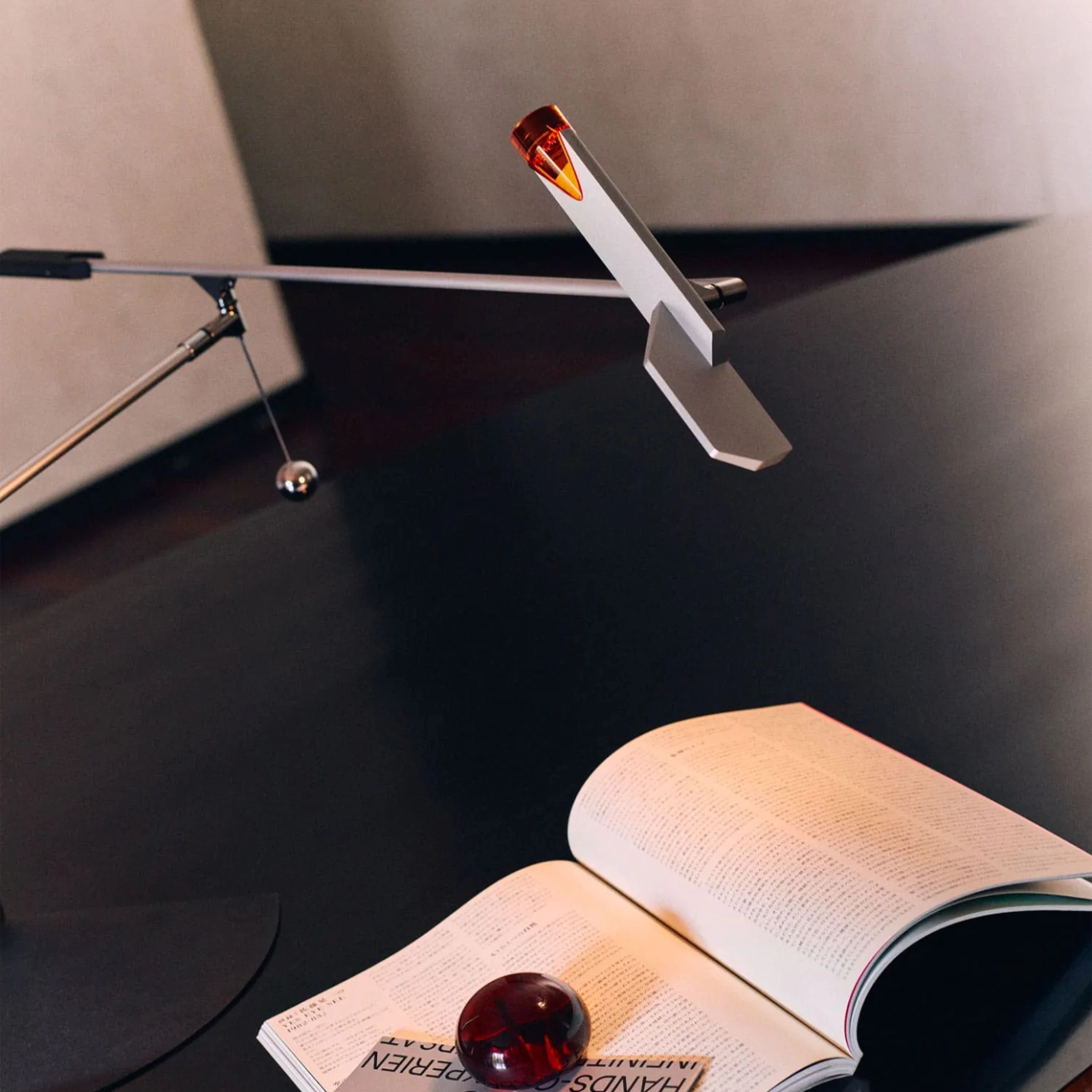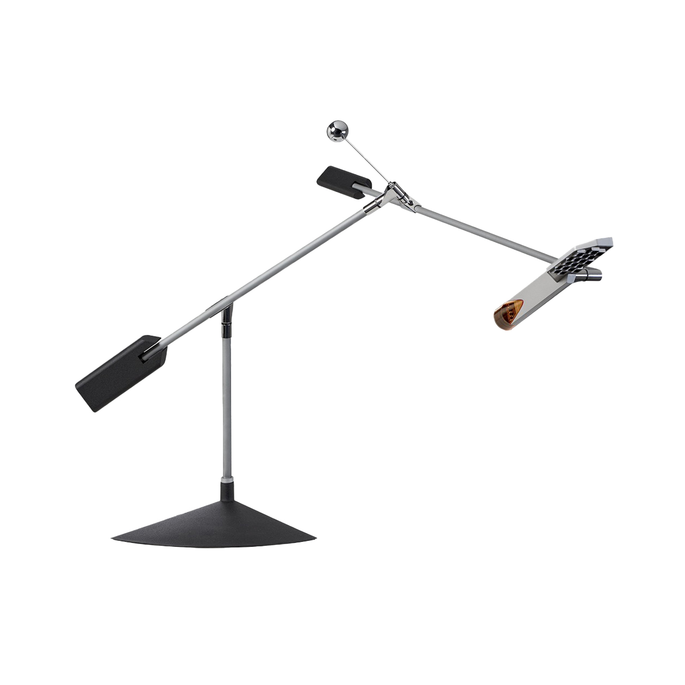 Halley est une structure orbitale qui permet littéralement tous les mouvements possibles, en restant immobile dans sa position, en déplaçant la tête de la lampe et en n’utilisant qu’une seule main. Avec pas moins de 6 articulations et 360 degrés de rotation pour chacune d’entre elles, la lampe peut se déplacer librement dans un espace tridimensionnel. La boule sert de balancier pour l’ensemble du poids de l’appareil, ce qui assure sa stabilité.