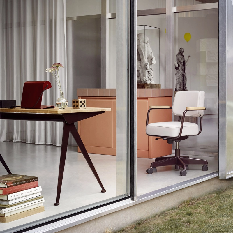 Né en 1901 à Paris, Jean Prouvé est apprenti orfèvre chez Emile Robert à Enghien et Szabo à Paris, avant de poursuivre ses études à l’école supérieure de Nancy. Dès 1923, il s’affirme comme constructeur-concepteur au travers une œuvre architecturale et mobilière prônant une esthétique de la nécessité. En 1930, Jean Prouvé est cofondateur de l’association d’artistes «Union des Artistes Modernes» (U.A.M.), en 1931 il crée «Les Ateliers Jean Prouvé». C’est là que de nombreux meubles voient le jour dans les années 30, ainsi que les premiers éléments architecturaux préfabriqués. Son mobilier universitaire Cité (1931) ou Antony (1954) gère avec ingéniosité aspects utilitaires, respect et économie du matériau et exigences de la fabrication en série. Vitra réédite depuis quelques années déjà les plus beaux spécimens de sa production de mobilier. Parmi ses plus grands classiques du design, on retrouve Antony, un fauteuil unique en son genre. Ce dernier se distingue par sa structure surprenante que Jean Prouvé a su marier à une forme d’une dynamique frappante. On peut également citer la lampe murale pivotante Potence conçue en 1950 pour la maison « Tropique » considérée à juste titre comme le chef-d’œuvre puriste du designer.