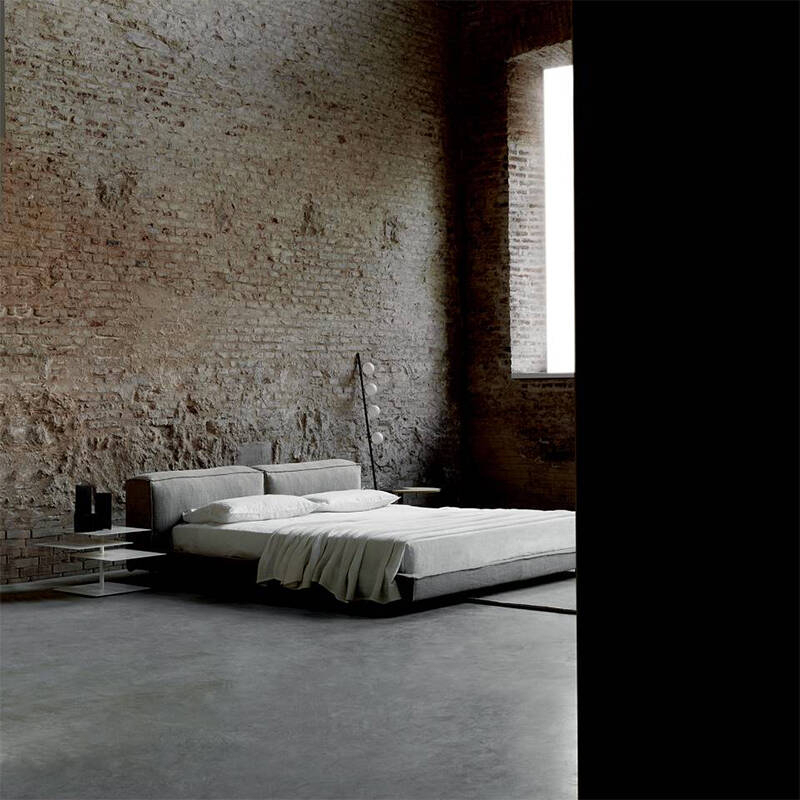 NeoWall Bed se caractérise par des volumes doux et un cadre rembourré qui entoure complètement la zone du matelas. Les pieds du