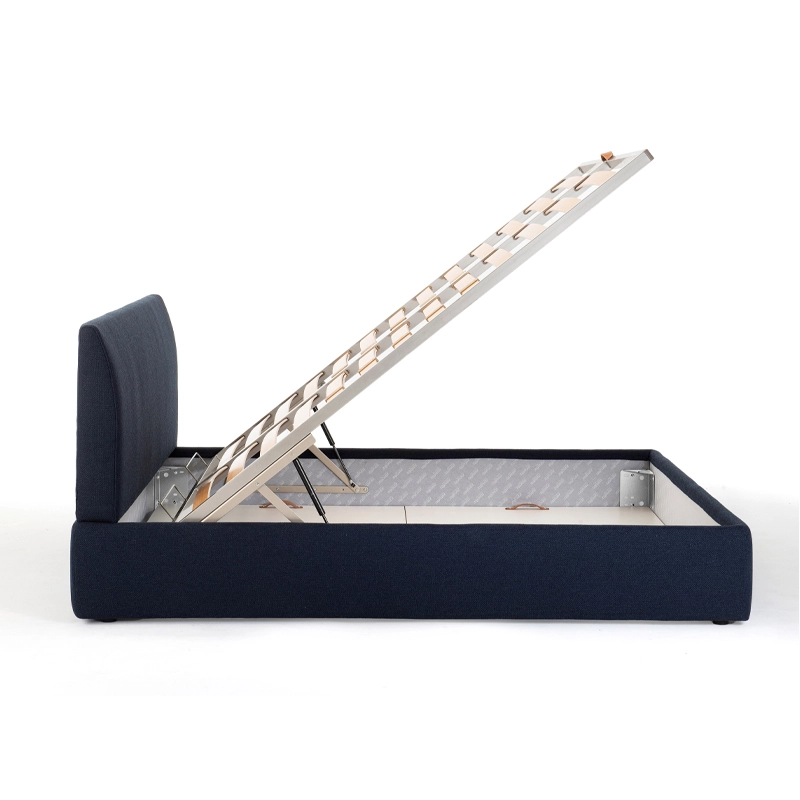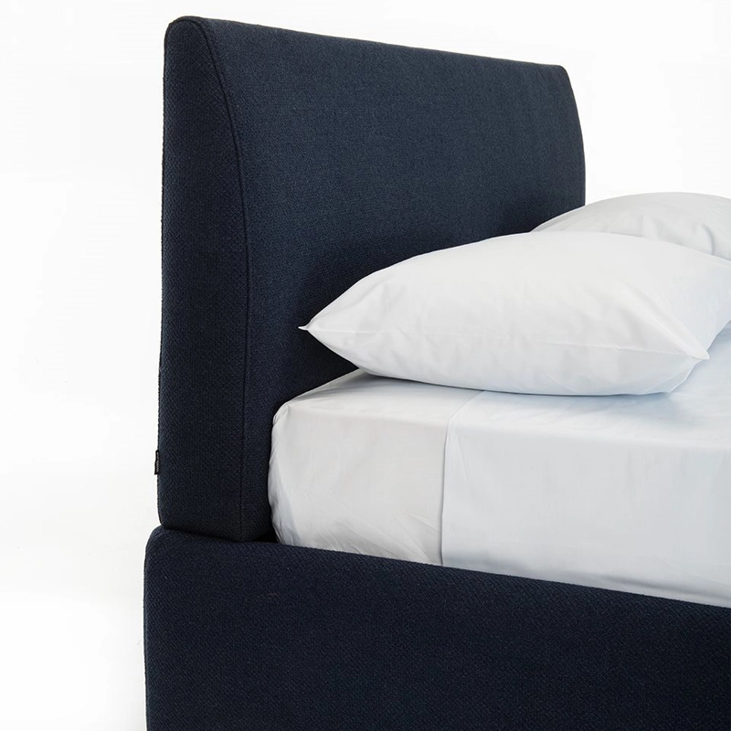 sommier en acier verni, suspensions en douves de hêtre courbé naturel, tête de lit rembourrée mousse de polyuréthane et revêtement extérieur déhoussable tissu