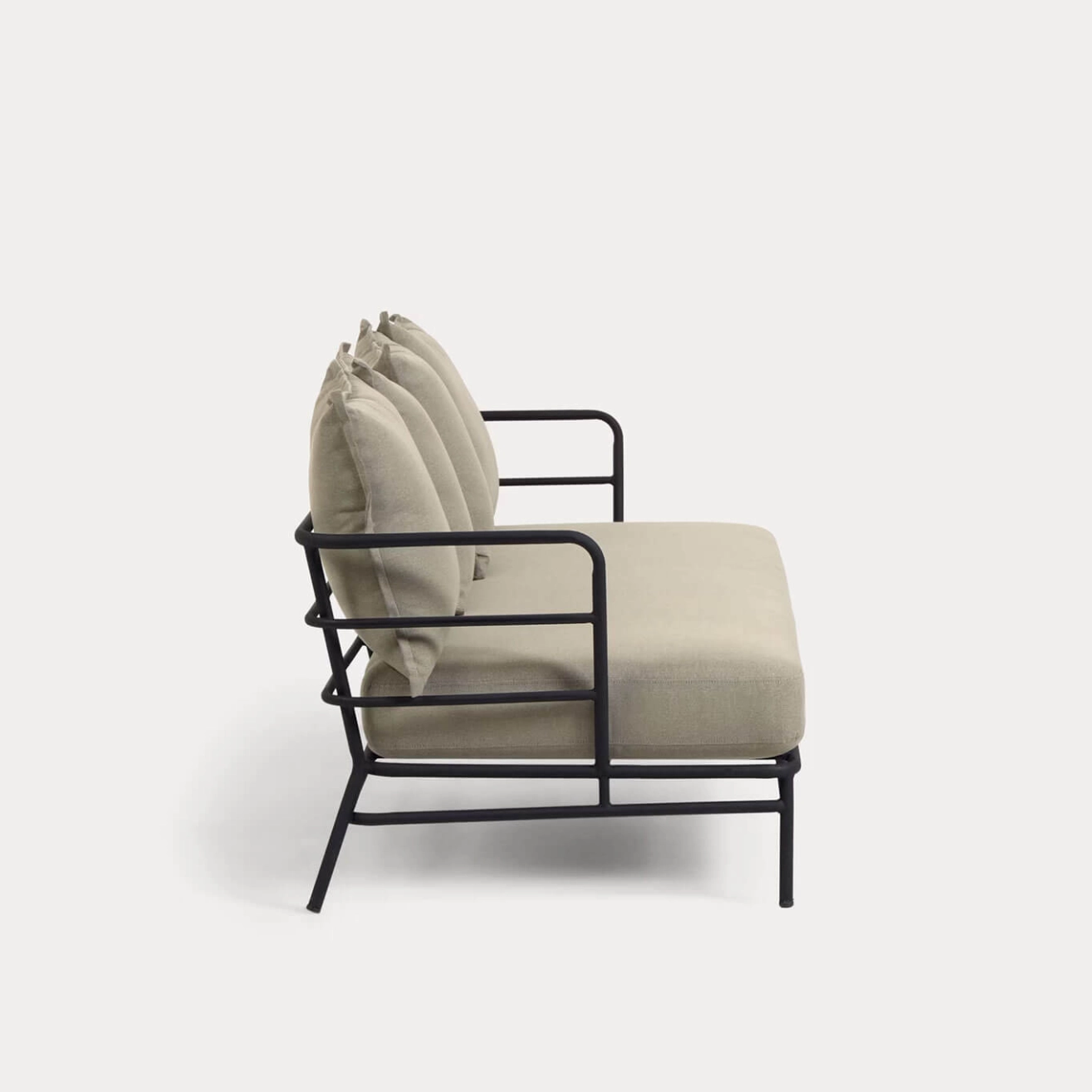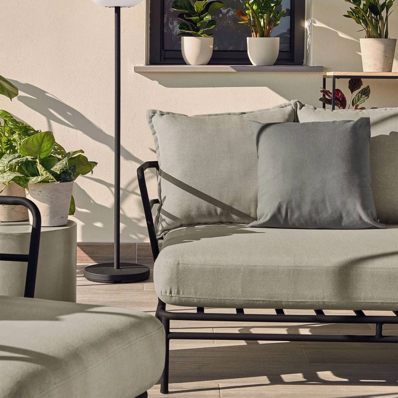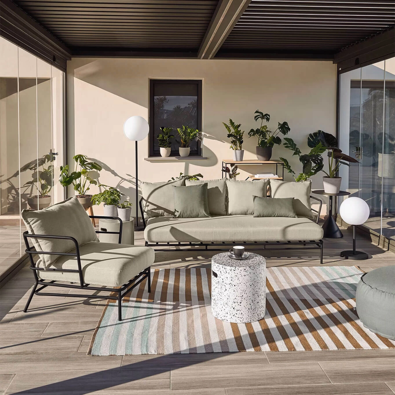 Mareluz, qui comprend également un fauteuil assorti. Livré déjà monté, ce canapé est prêt à l’usage dès sa réception. Sa structure en acier galvanisé peint en noir résiste aux rayons UV, à l’oxydation et à la corrosion, ce qui le rend idéal pour un usage en extérieur sous couvert. Alliant confort et design, ce canapé léger et épuré apporte luminosité et sensation d’espace, invitant à la détente. Il est livré avec des coussins déhoussables, qu’il est recommandé de protéger en cas de pluie. L’acier est l’élément central de cette pièce, qui combine solidité, style et confort, et existe en plusieurs coloris pour s’adapter à tous les espaces extérieurs.