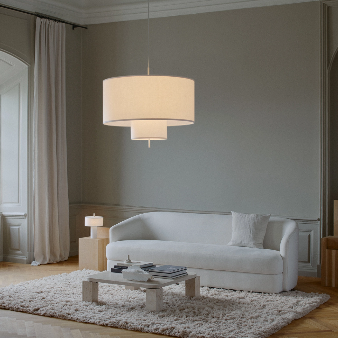 Conçue par le designer John Asbury pour New Works, la famille de suspensions Margin représente une interprétation moderne d'un luminaire classique. Margin se distingue par ses abat-jours superposés qui diffusent délicatement la lumière, créant ainsi instantanément une atmosphère chaleureuse et accueillante. La douceur du tissu est équilibrée par le design épuré et graphique de la suspension Margin, conférant ainsi une présence et un volume à l'espace. Les proportions réfléchies, les détails soignés et la structure en forme de gradins de la lampe contribuent à affiner l'esthétique originale caractéristique de la famille de suspensions Margin de New Works. La suspension Margin se décline en trois dimensions : 50, 70 et 90 centimètres de diamètre.