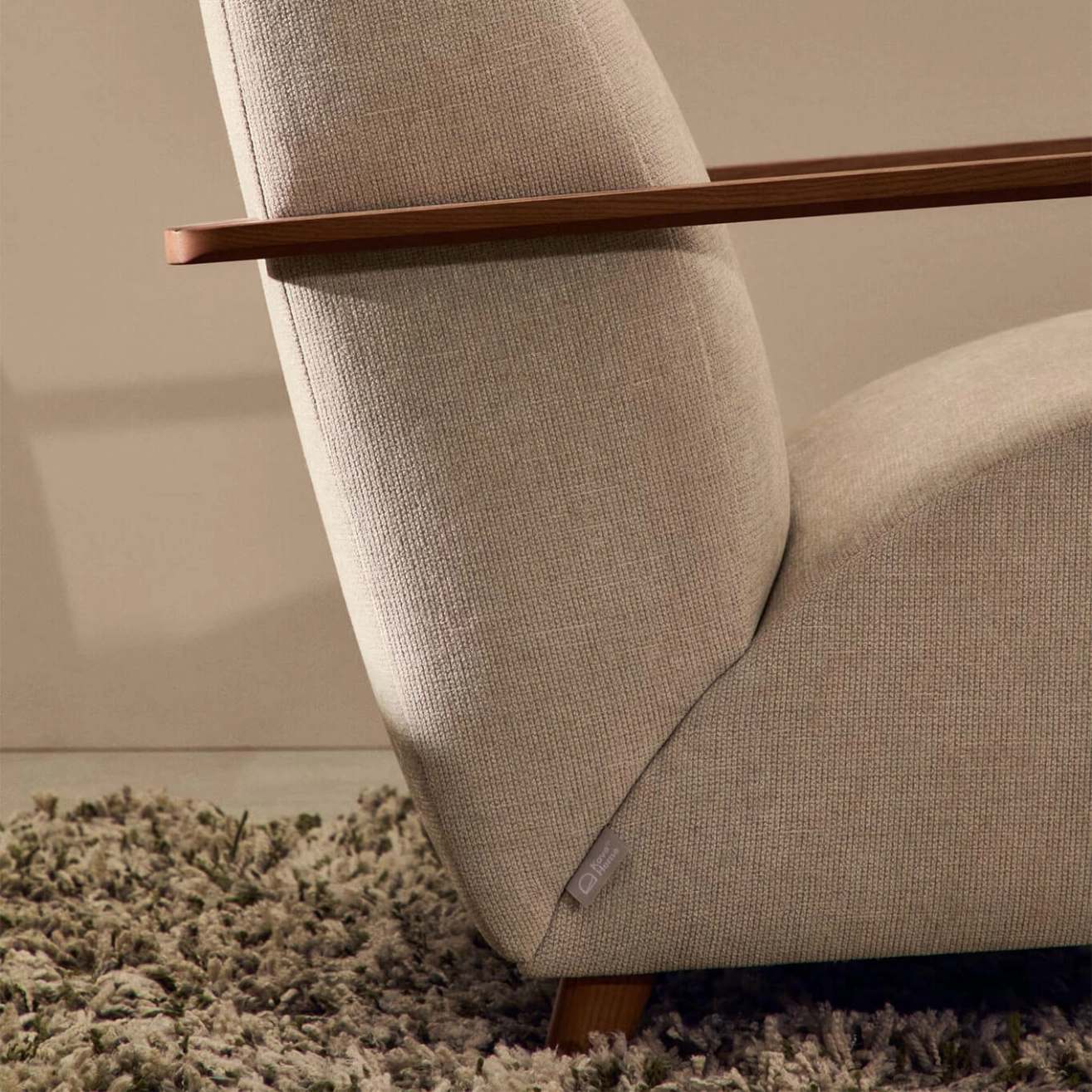 Meghan est un fauteuil en chenille avec accoudoirs et pieds en bois de frêne finition noyer, issu de la collection Kave Home. Son design minimaliste et décontracté met en valeur la structure apparente en bois de frêne massif. L’assise et le dossier sont rembourrés de mousse pour un confort moyennement moelleux, et la structure combine bois de pin et panneaux de particules E0. Le tissu bénéficie d’un traitement anti-taches pour un entretien facilité. Produite localement en Europe selon des procédés artisanaux, Meghan réduit les émissions de CO2 pour un impact environnemental moindre. Le bois est certifié FSC Mix Credit, fabriqué à partir de fibres issues de forêts certifiées FSC et de bois contrôlé FSC. Ce fauteuil allie simplicité, confort et style décontracté.