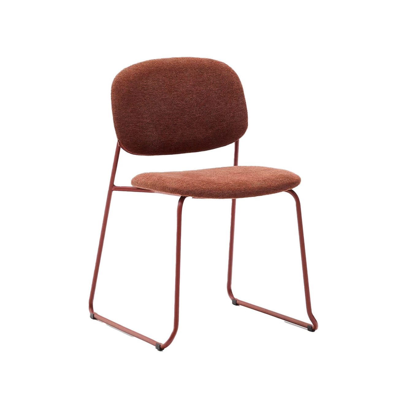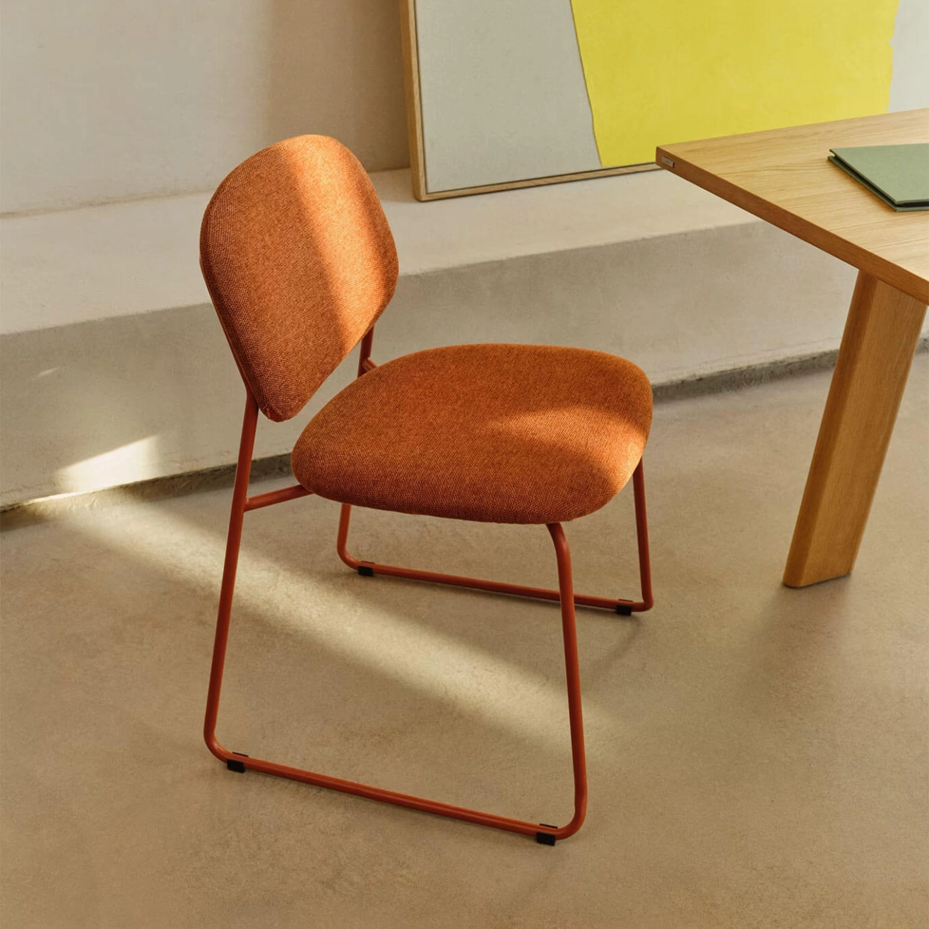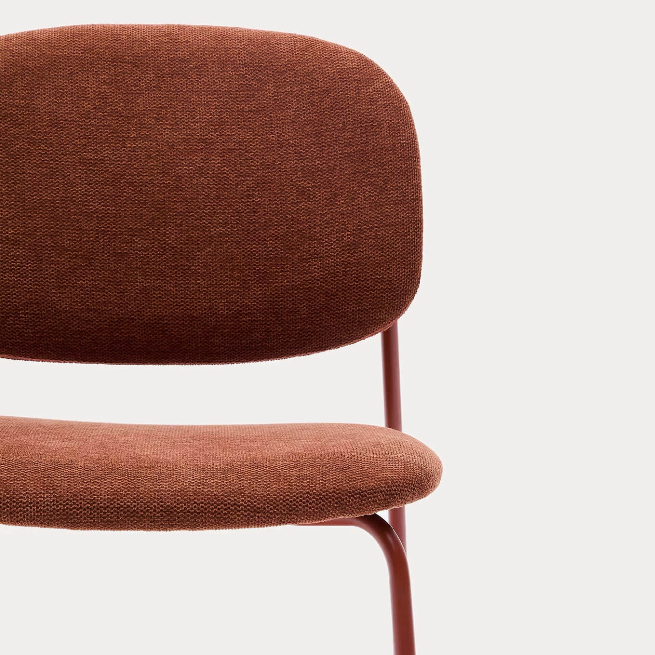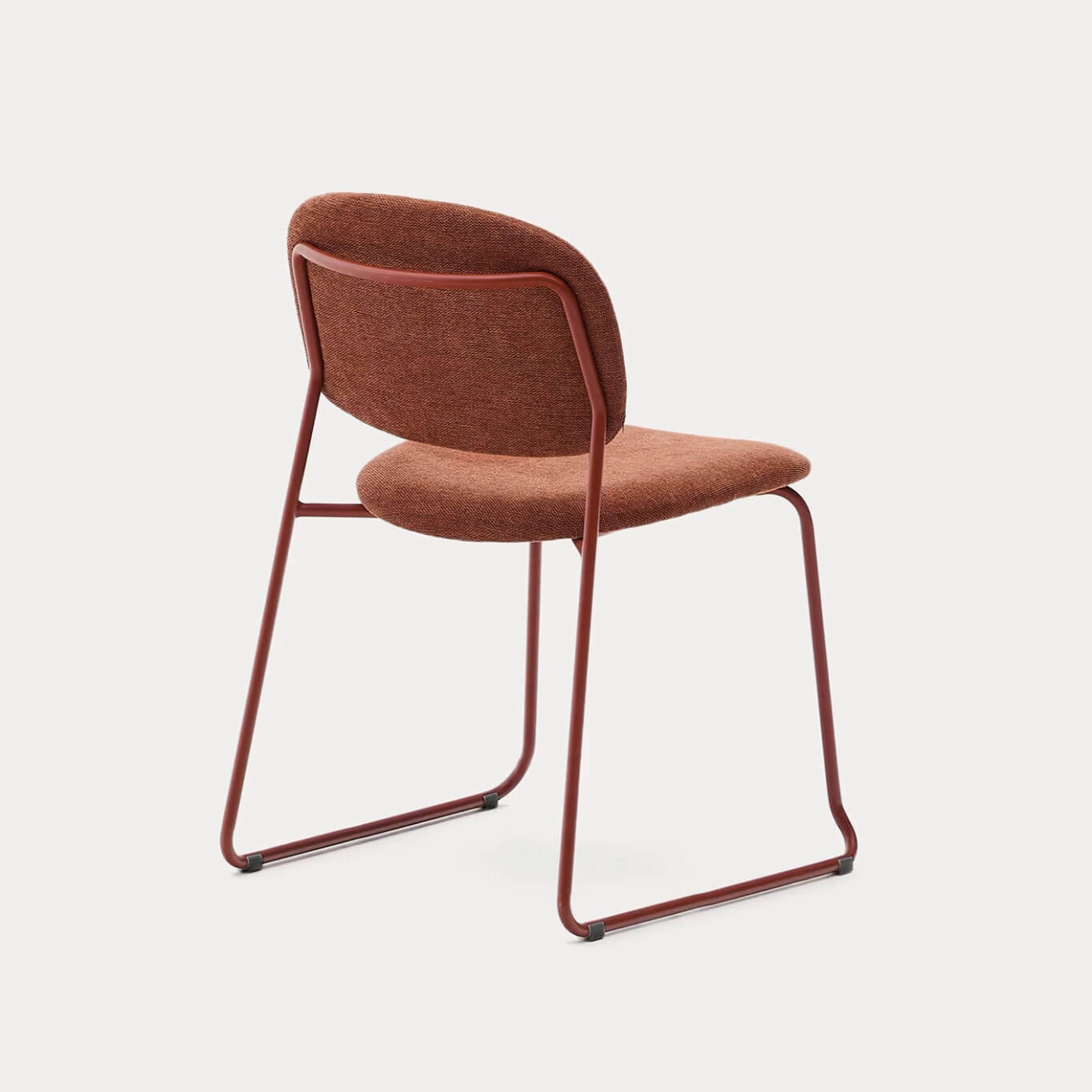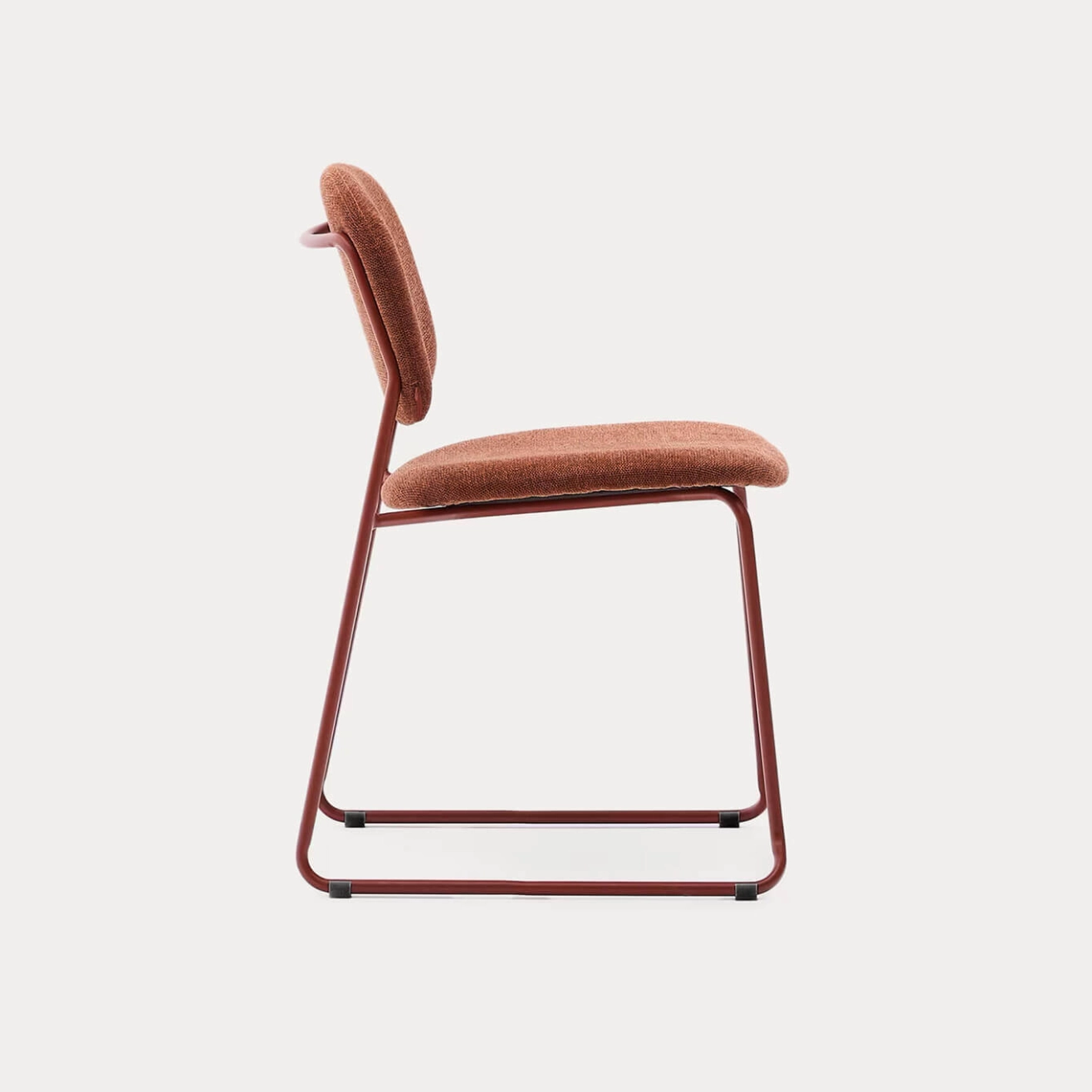 Meli est une chaise empilable en chenille terracota avec pieds en métal microtexturé terracota, issue de la collection