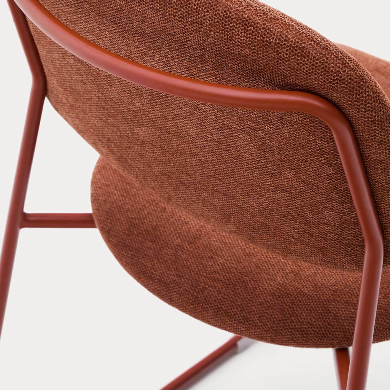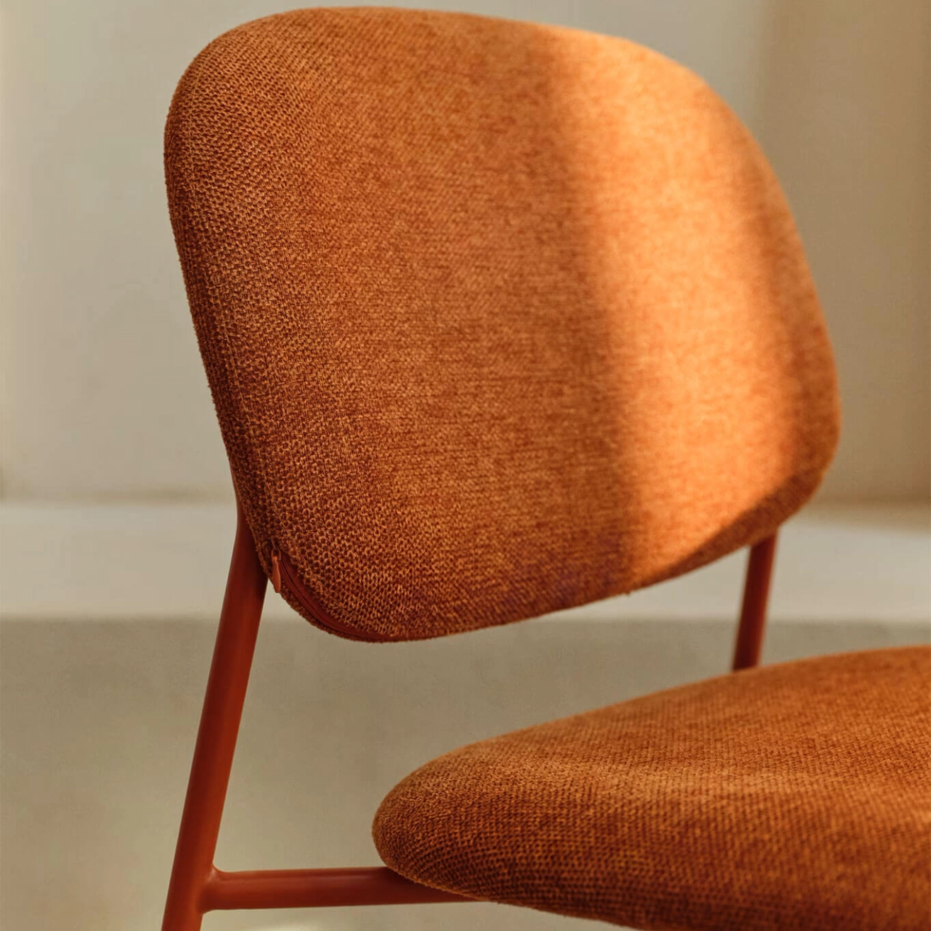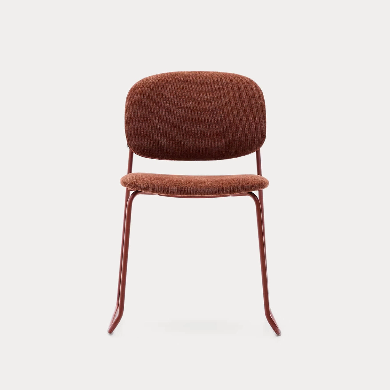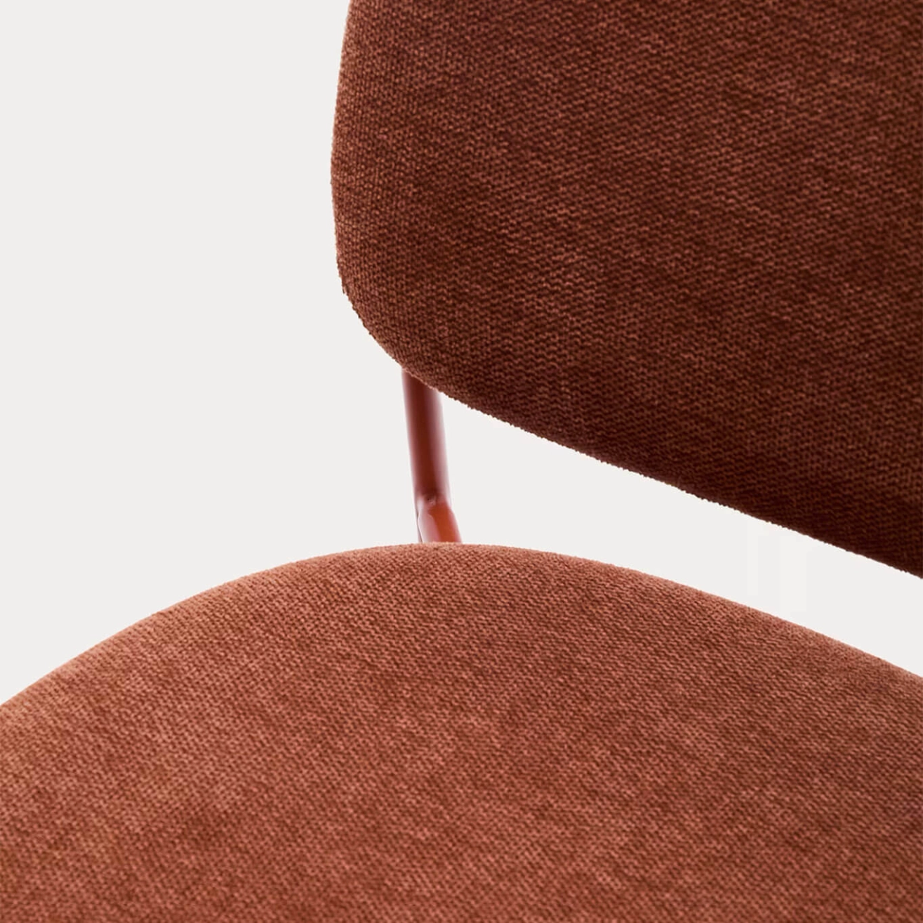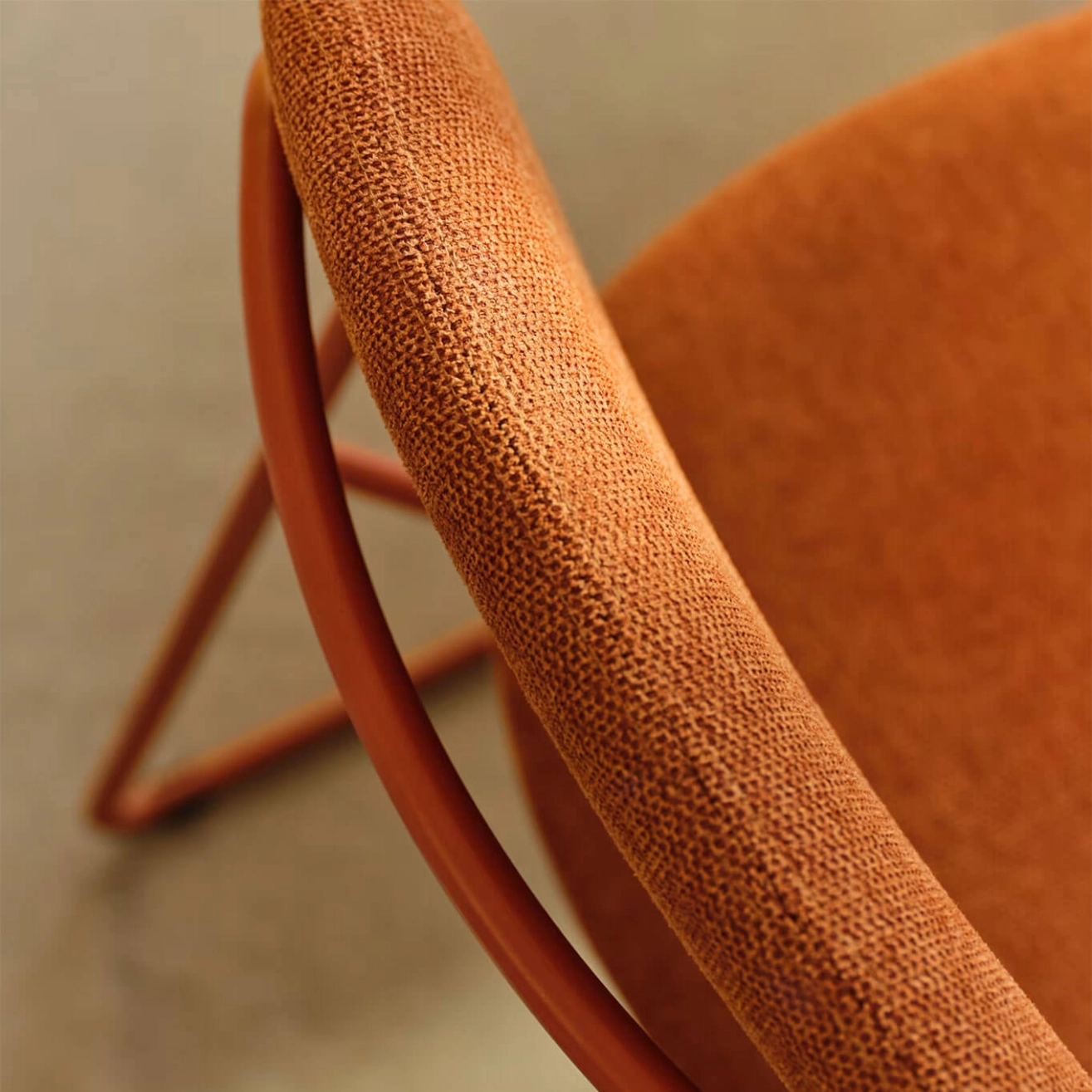 Meli est une chaise empilable en chenille terracota avec pieds en métal microtexturé terracota, issue de la collection