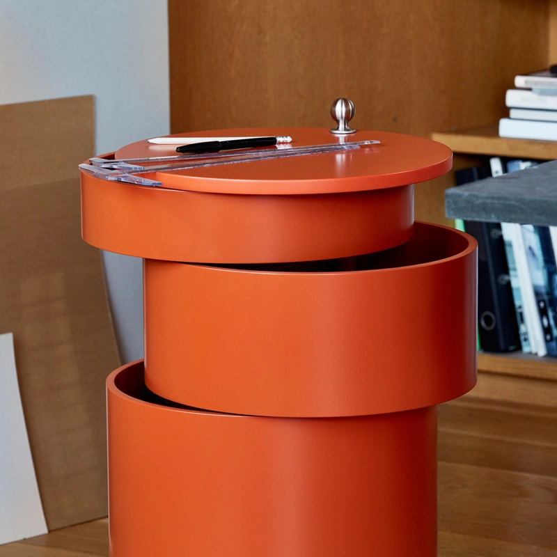 Barboy de Verner Panton est à la fois une table d'appoint et un meuble de rangement mobile. Il est composé de quatre parties cylindriques qui pivotent entièrement vers l'extérieur, permettant de visualiser et d'utiliser toute la surface des plateaux de rangement. Edité par Verpan, le rangement Barboy représente parfaitement le travail de Verner Panton. Il combine une surface matte avec une poignée et des roulettes chromées, qui créent un contraste élégant.