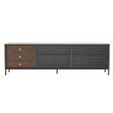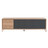 Dessinée par Mathieu Galard, directeur artistique d’Hartô, Gabin est une collection de rangements qui allie simplicité des formes et beauté des matériaux. Elle se démarque principalement par le motif inspiré du cannage, ainsi que par l'association bois et métal. Cet élégant buffet bas est doté de deux porte coulissantes ajourées et de trois tiroirs avec poignées en laiton brossé. Il se décline également dans une version sans tiroirs. Avec sa silhouette épurée et le motif graphique de ses portes, le buffet design Gabin trouvera sa place dans tous les intérieurs contemporains. Le bloc tiroirs peut être dévissé pour être placé à gauche ou à droite.