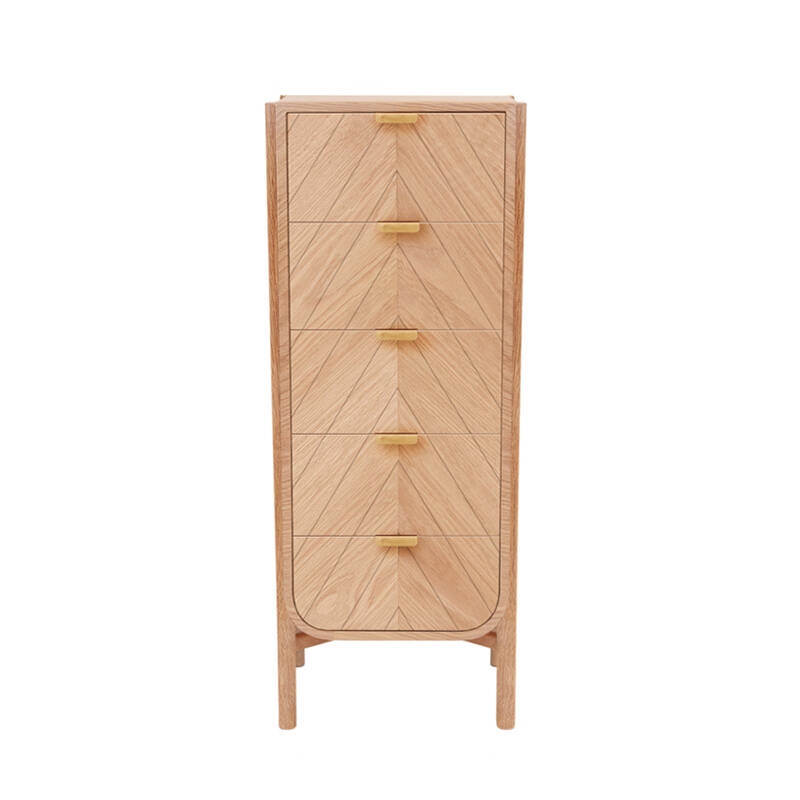 Marius est une collection de rangements pour laquelle le designer Pierre-François Dubois s'est inspiré de l'univers maritime. La forme des coques de bateau est détournée pour créer la forme si singulière des rangements. Le motif géométrique, inscrit sur la façade des portes ou des tiroirs, rappelle quant à lui les voiles de bateau. Avec ses cinq tiroirs, le chiffonnier Marius de Hartô est très fonctionnel dans une entrée ou une chambre. Ses petites poignées en laiton apportent une touche d'élégance.