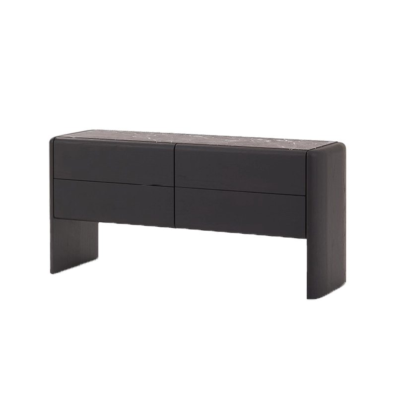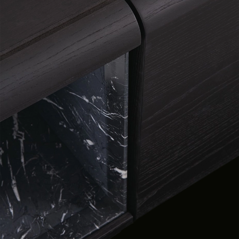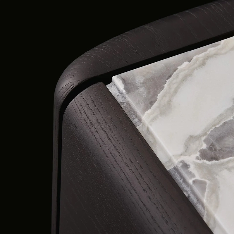 structure externe en orme noir et structure interne en chêne blanc. plateau en marbre marquina poli